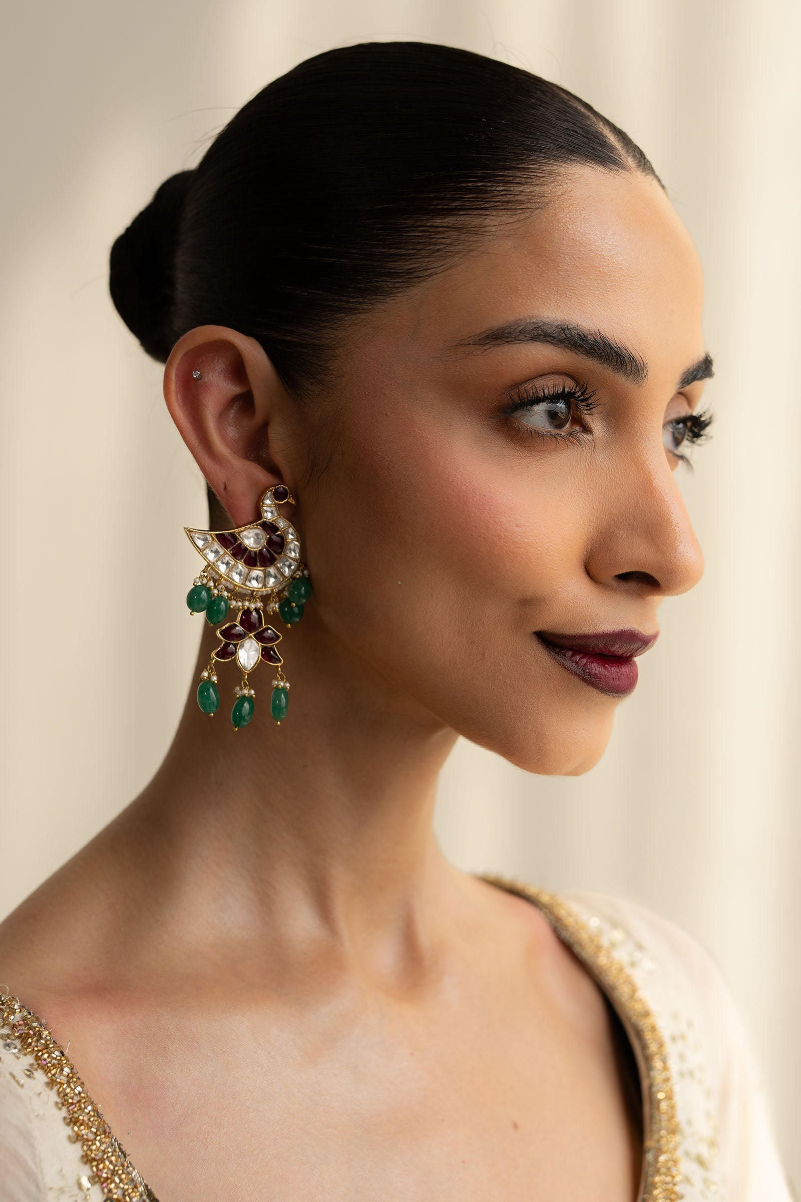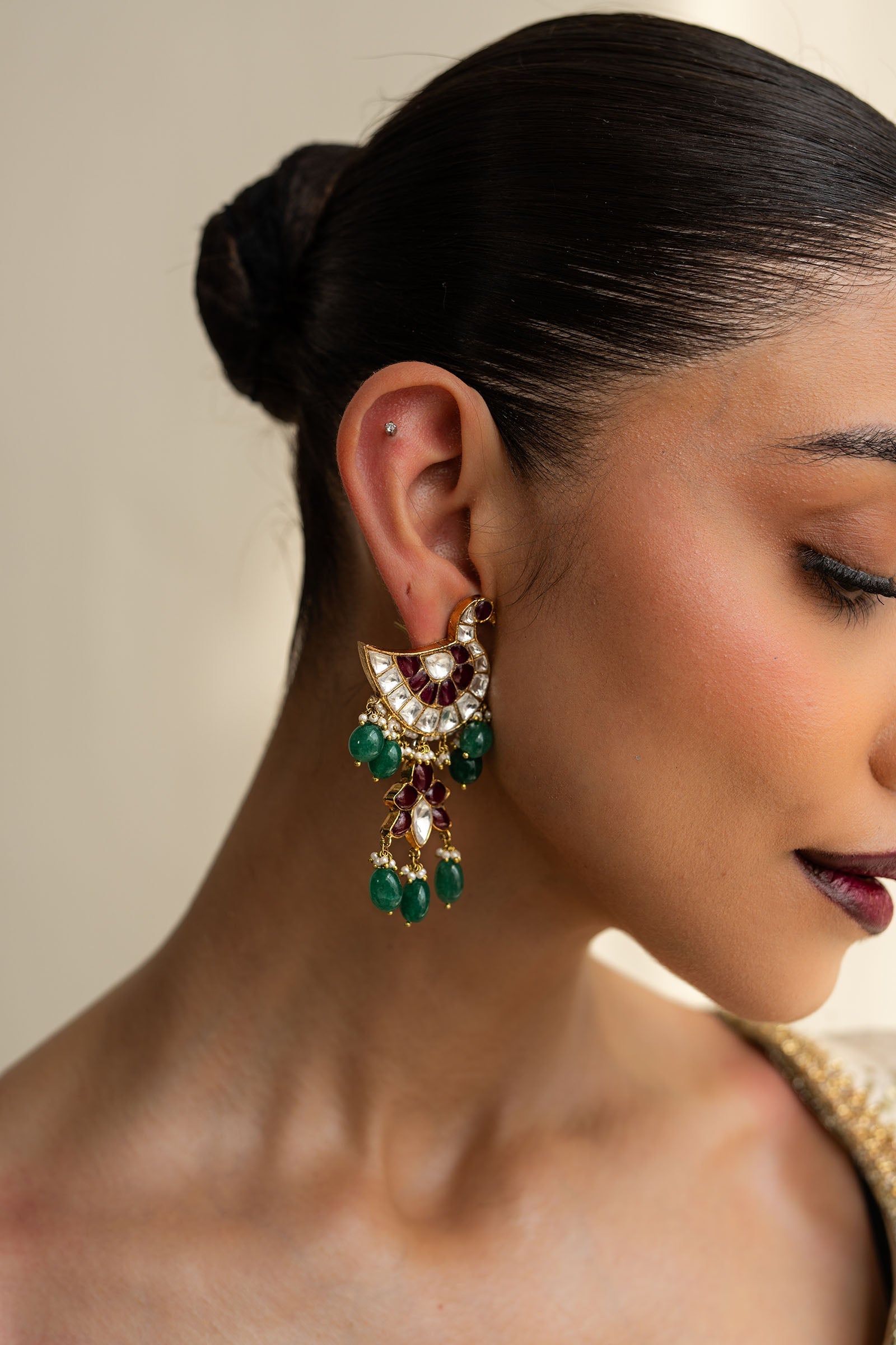 Captivating earrings that pair the serene elegance of jade with the vibrant allure of red chetam. Accented with luminous zircon and delicate pearl peroi, and finished in rich 22k gold plating, they embody a balance of warmth, grace, and timeless refinement.