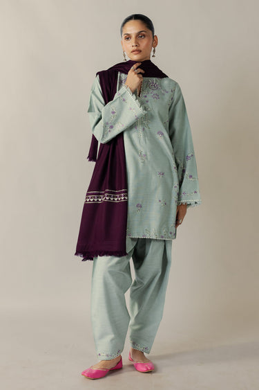 Our loose-fit short shirt features intricate embroidery all over the front and sleeves, paired with tapered shalwar for a modern silhouette. The look is completed with a contrasting embroidered shawl