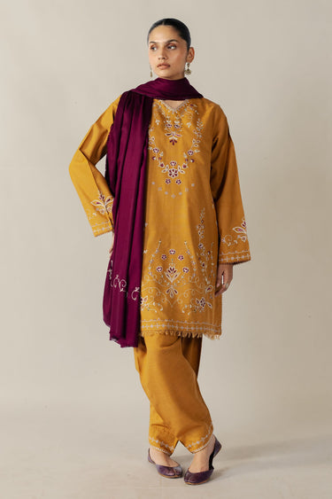 A short shirt adorned with beige and plum embroidery, paired with a tapered shalwar. The look is elevated with an embroidered plum shawl, adding depth and elegant sophistication to the ensemble.