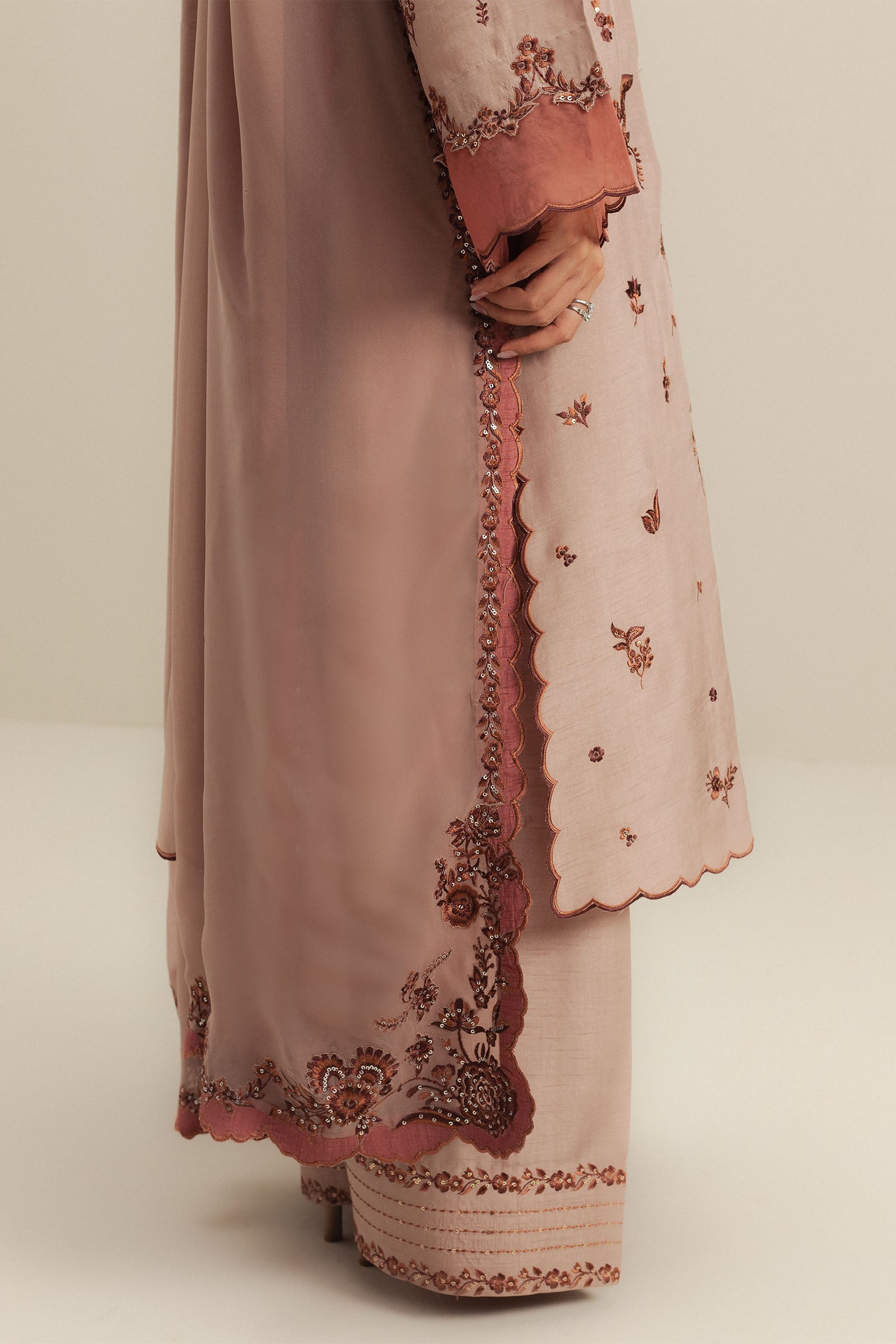 Finished with a georgette chiffon dupatta, featuring contrast scalloped embroidery along the edges. The light fabric adds a touch of softness and completes the outfit with understated luxury.