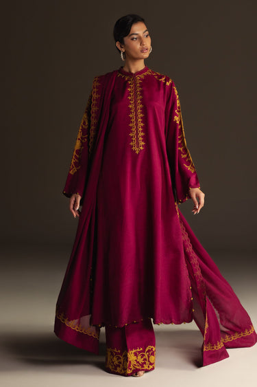 Ameera in soft plum strikes a delicate balance between freshness and refinement. The raw silk shirt features light green aari embroidery across the front and sleeves, accentuated by contrast finishing on the neckline, hem, and cuffs. Paired with loose-fit trousers and a lightly embroidered georgette dupatta, it’s a subtle yet striking choice for any occasion.