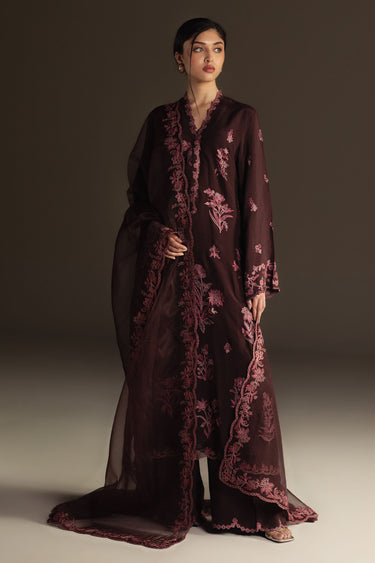 Maheen in warm brown combines earthy elegance with exquisite artistry. The shirt features contrasting aari embroidery that lends character and dimension, while the simple raw silk trousers keep the silhouette refined. Finished with a stunning embroidered organza dupatta.