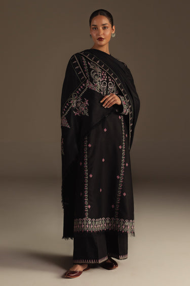 An elegant black paneled kurta paired with matching wide-hem pants and a coordinated embroidered shawl. The ensemble is delicately crafted with intricate Kashmiri embroidery on Kurta and the shawl is adorned with embroidered border on all four sides.