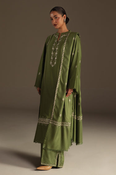 An olive-toned long kurta with fine embroidery on the shirt and wide-hem matching pants. The matching marina shawl is detailed with an embroidered border that creates a harmonious winter look.