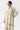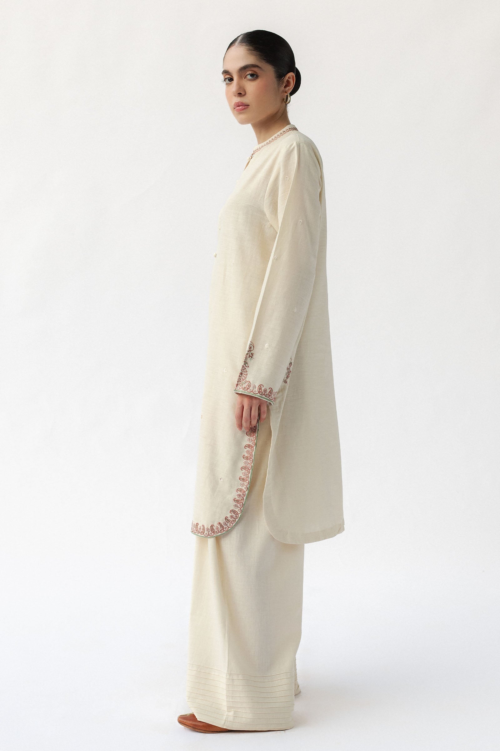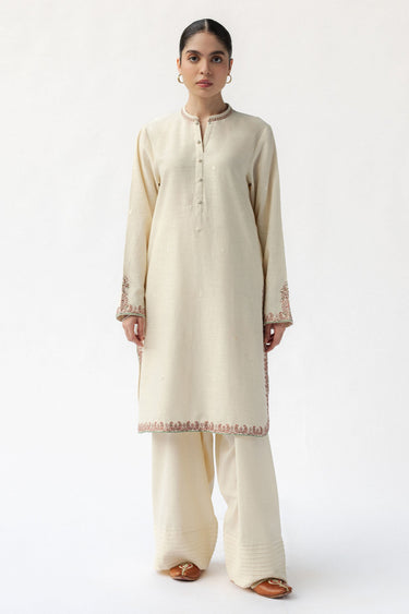 A three-piece ivory linen suit with a matching shawl, featuring a classic kurta adorned with delicate embroidery along the slits for a timeless, elegant look.