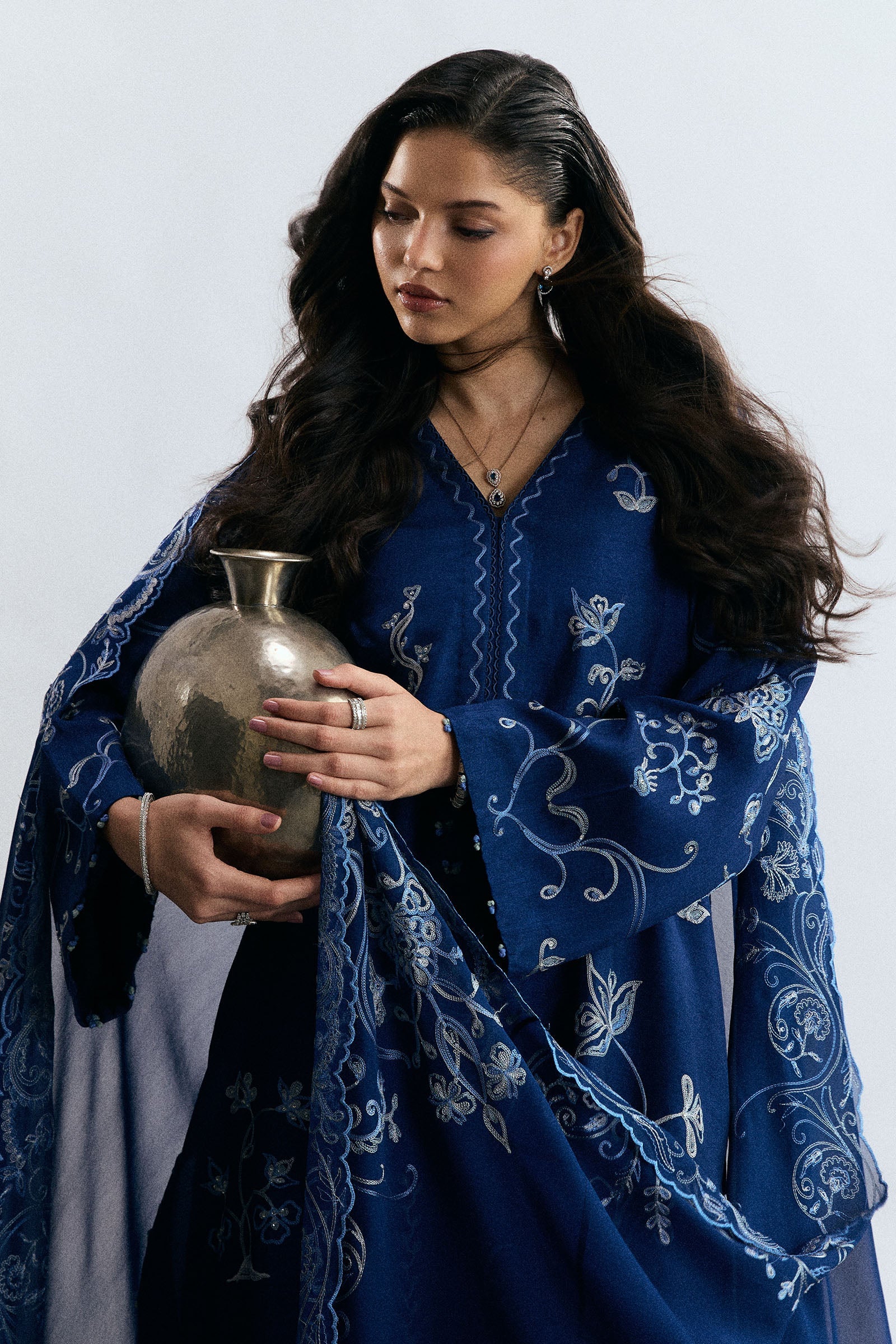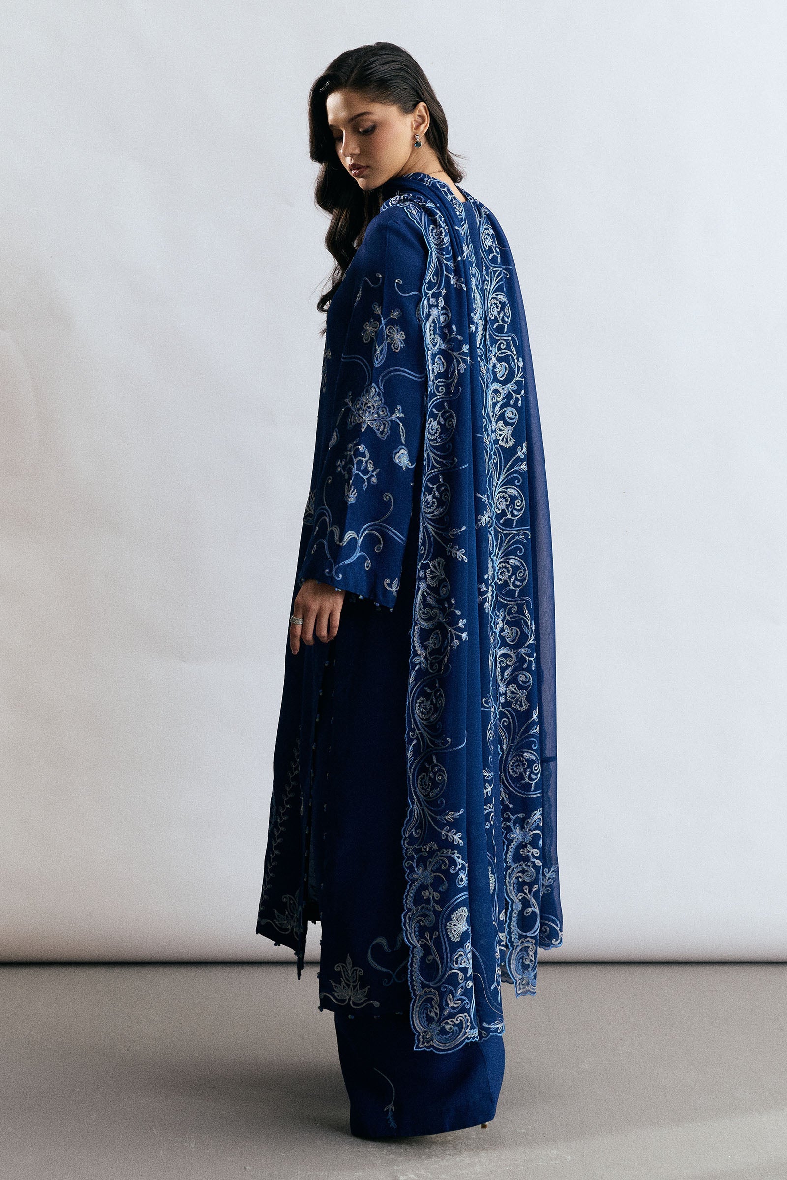 A midnight blue raw silk ensemble that seamlessly blends traditional craftsmanship with modern elegance. The shirt is adorned with exquisite aari embroidery in shades of ivory and space blue, enriched with delicate beadwork for added depth and cultural richness. Paired with loose-fit embroidered pants, the look is completed with a flowing aari embroidered chiffon georgette dupatta, creating a timeless and refined festive silhouette.