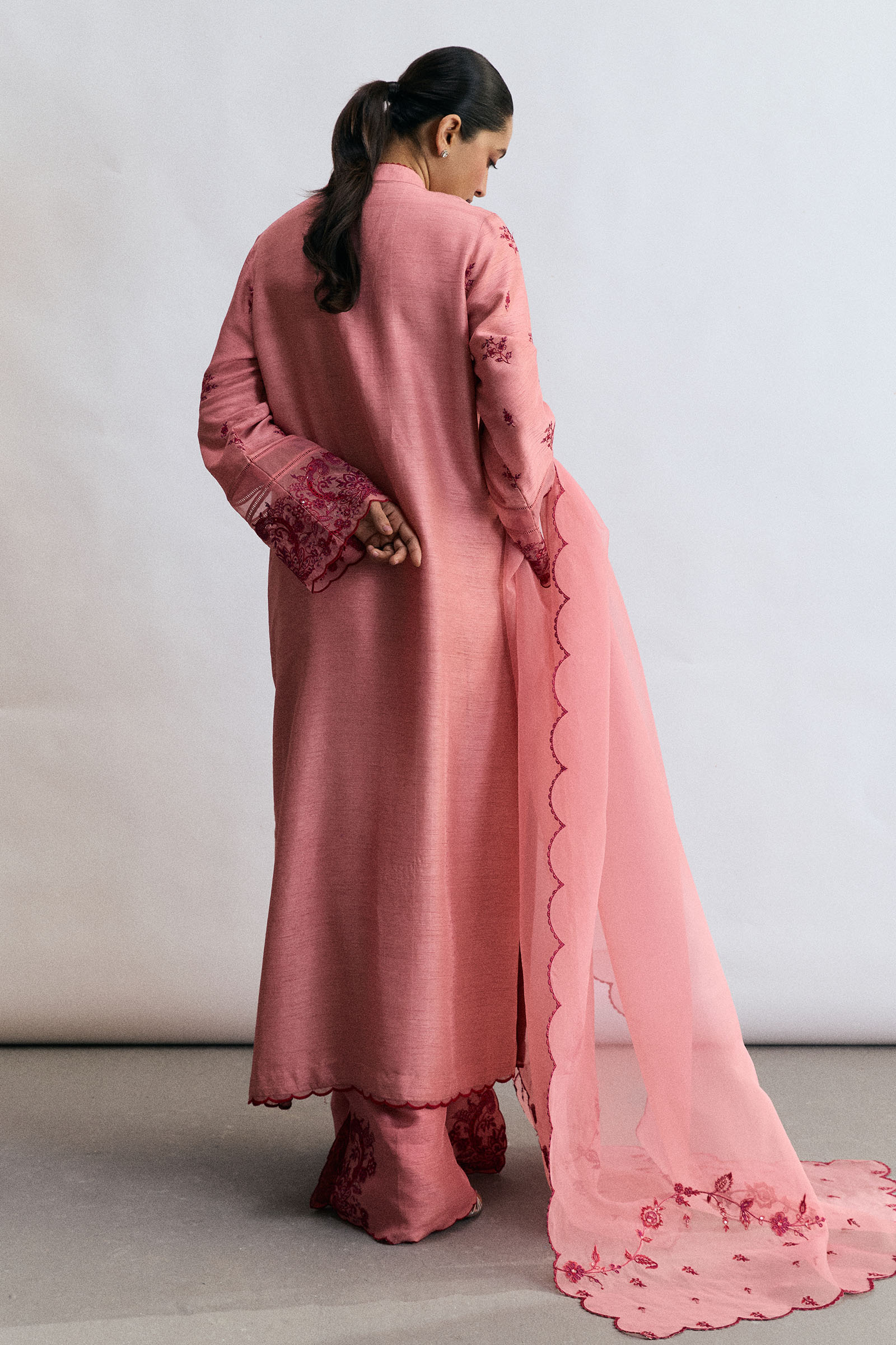 A tea pink raw silk ensemble adorned with bold crimson embroidery, accented with classic design elements for a refined festive appeal. The shirt features striking contrast embroidery with delicate organza trims, paired with a straight-fit embroidered trouser. A sheer embroidered organza dupatta completes the look, radiating understated elegance suited for any occasion.