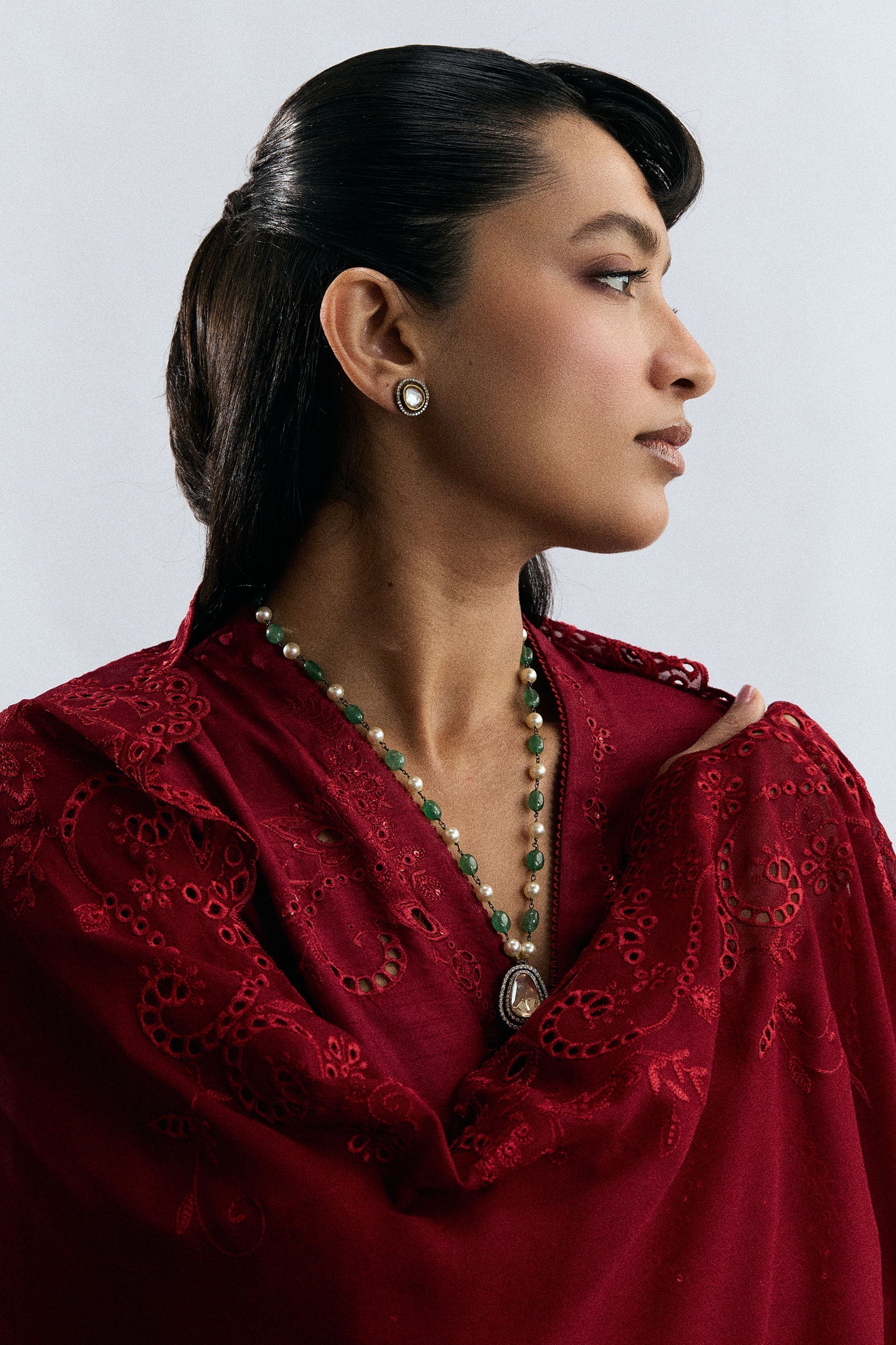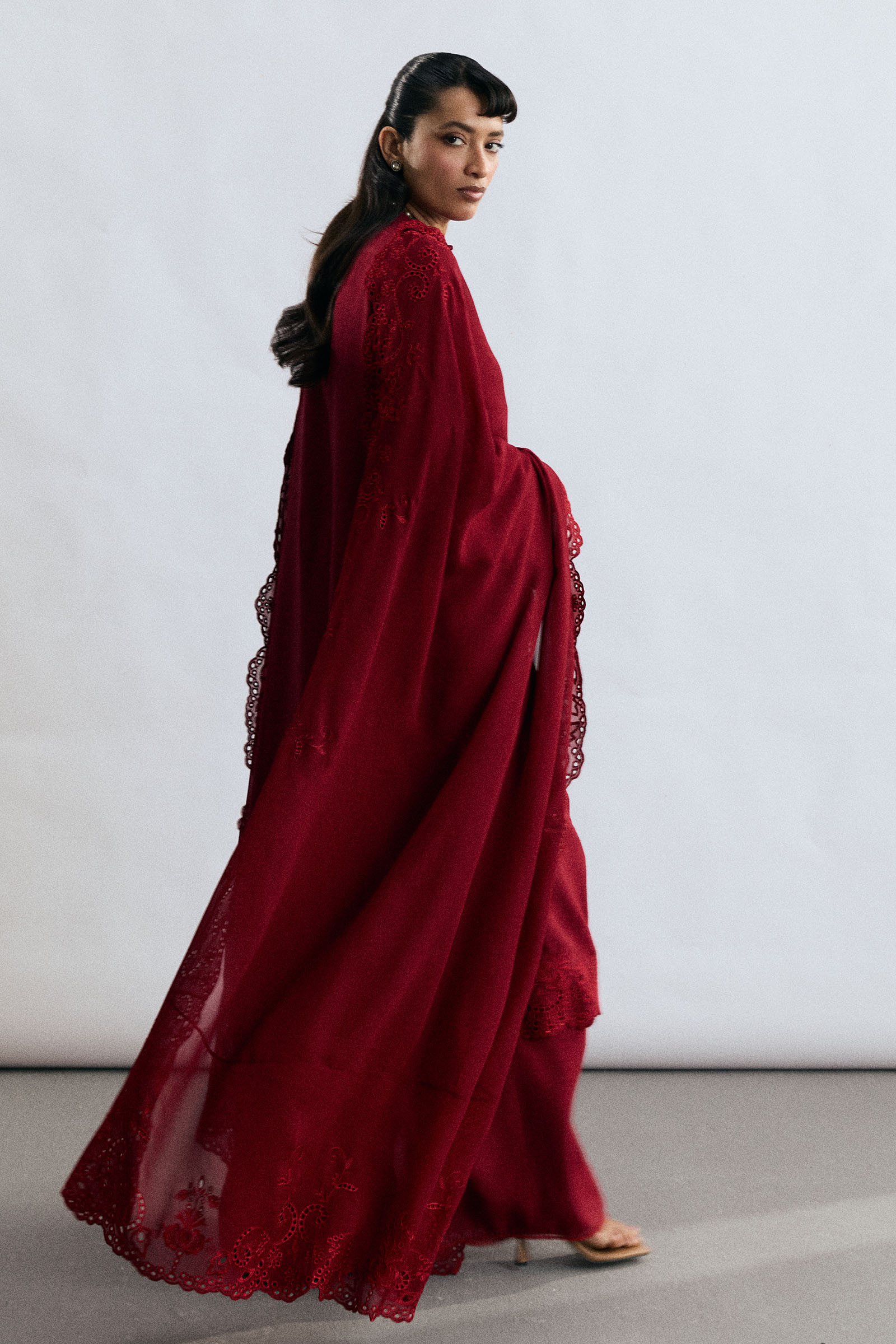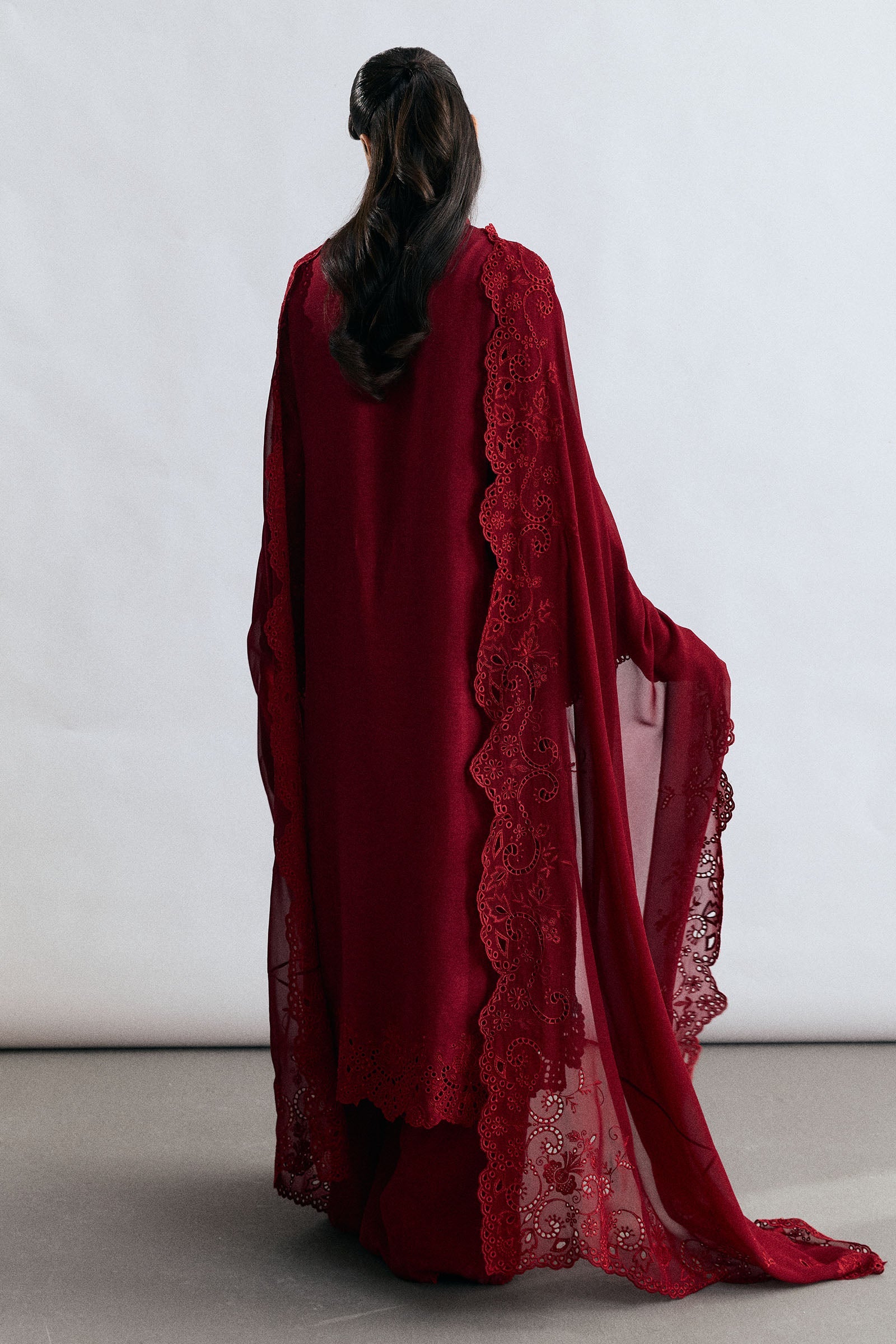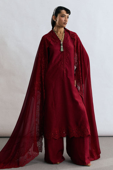 A ruby red raw silk ensemble that radiates understated festive elegance. The shirt is adorned with resham schiffli embroidery, complemented by delicate cutwork and lace detailing that add depth to its modern, sleek silhouette. Paired with straight-fit pants, the look is completed with an embroidered chiffon georgette dupatta, creating a refined ensemble suited for celebrations and special occasions alike.