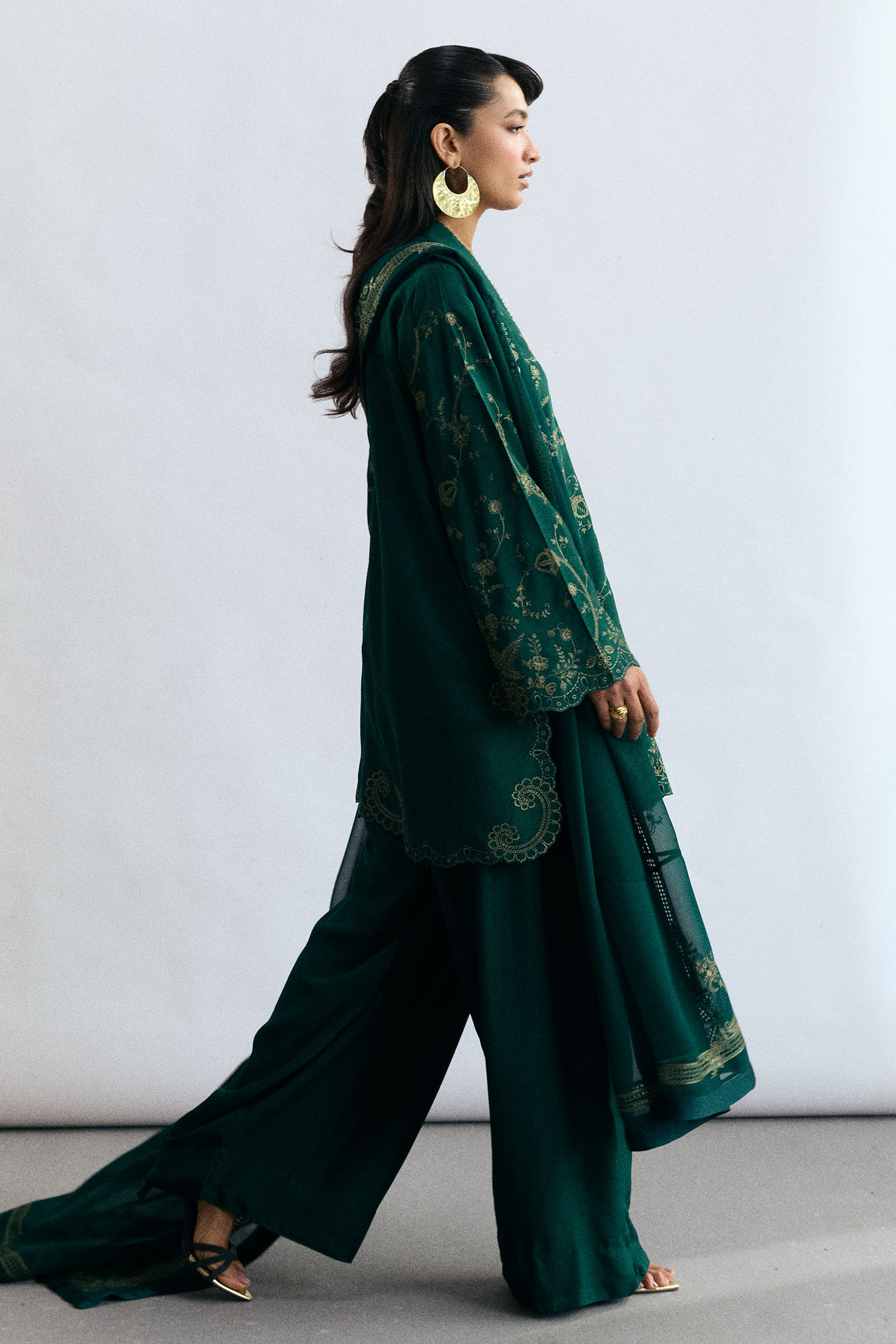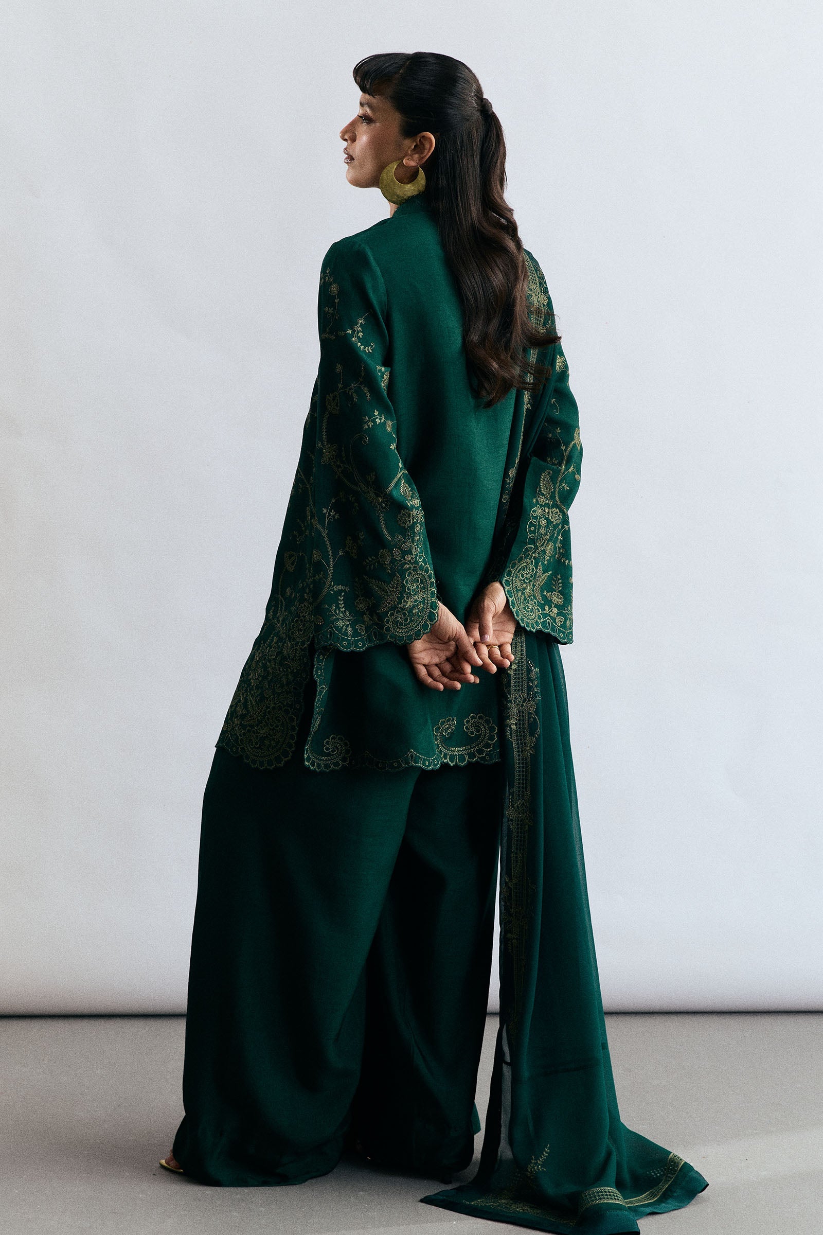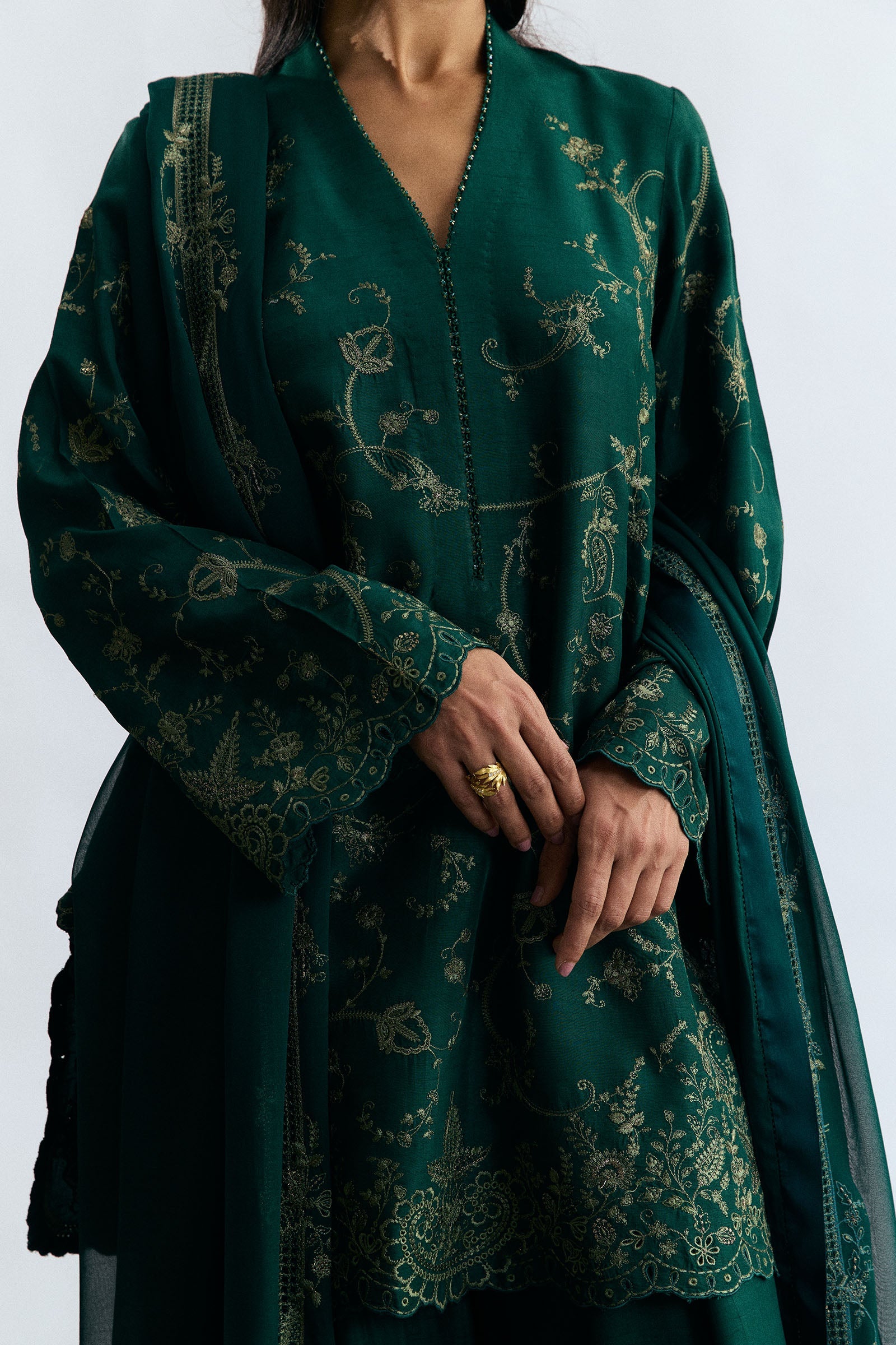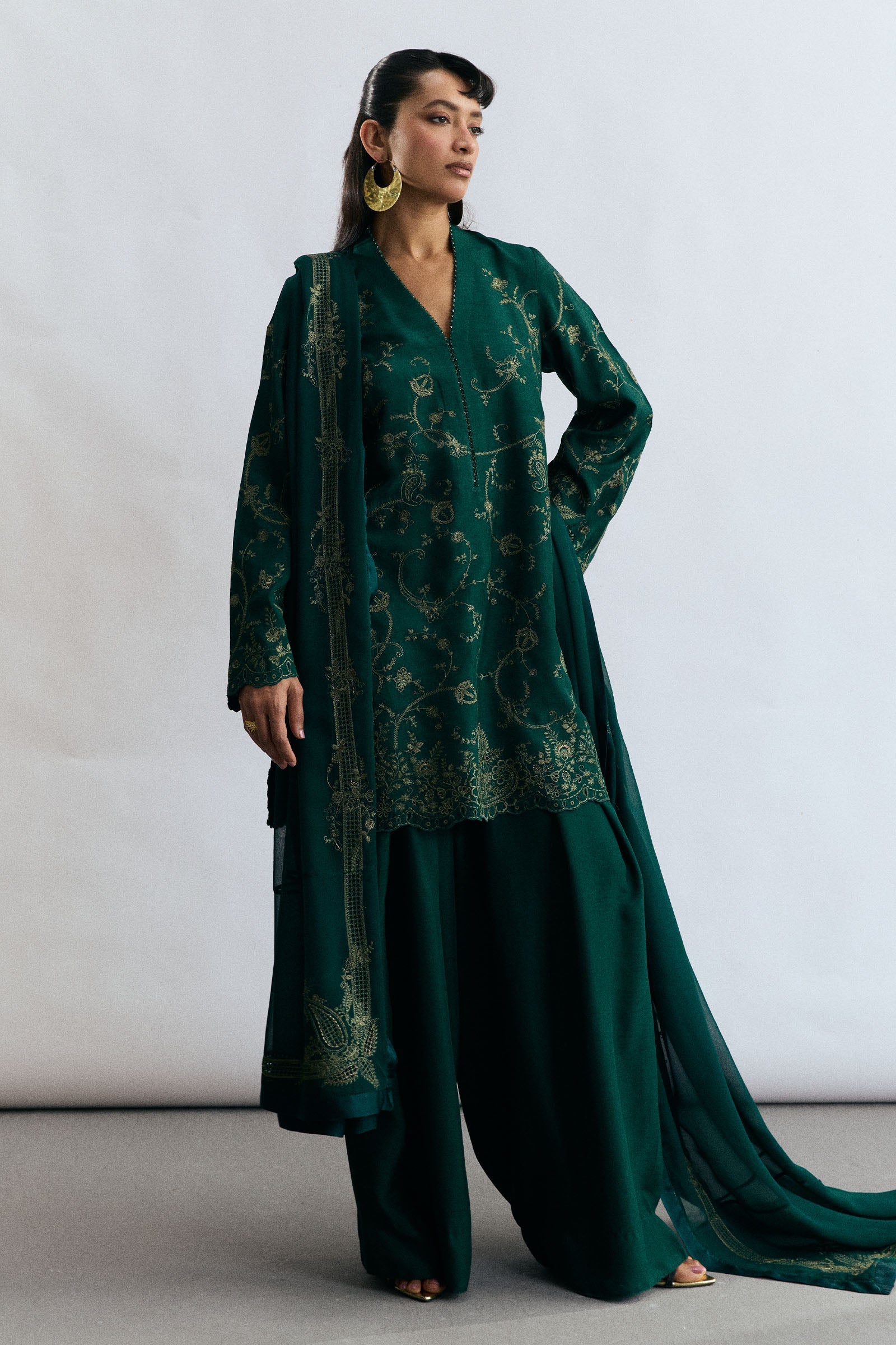 A deep green raw silk ensemble that exudes timeless festive elegance. The shirt features intricate resham and antique tila embroidery, finished with delicate schiffli detailing along the hem for added texture. Paired with a classic shalwar, the look is completed with an embroidered chiffon georgette dupatta with satin finishing, creating a luxurious silhouette rooted in tradition.
