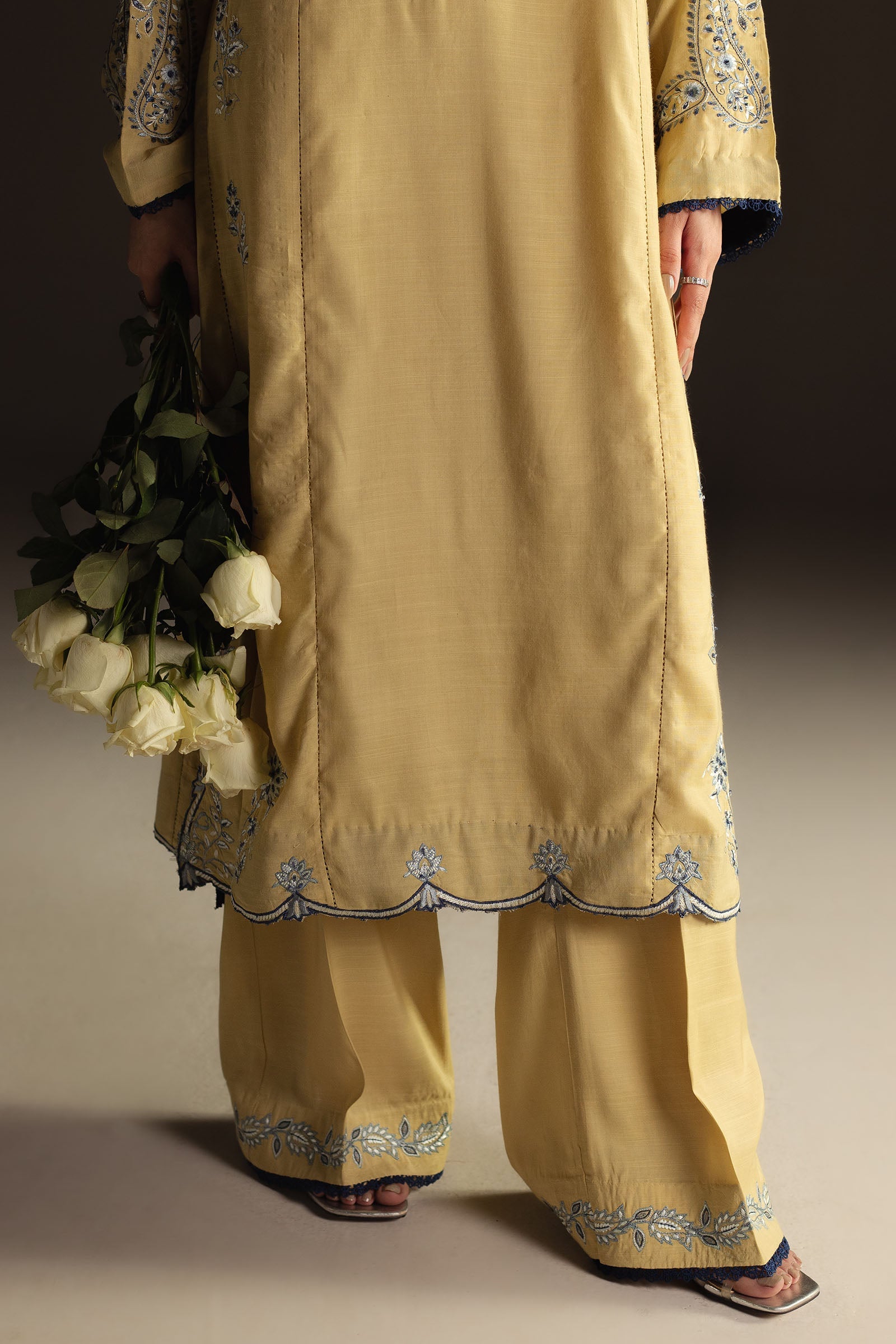 Soft and radiant, Lina in pale yellow brings a refreshing charm to festive dressing. The shirt features resham embroidery and beadwork in hues of blue, blending traditional motifs with a modern sensibility. Paired with embroidered straight-fit trousers and an embroidered silk dupatta with contrasting pallu finishing, it’s a look that effortlessly transitions from day to evening with sophistication.