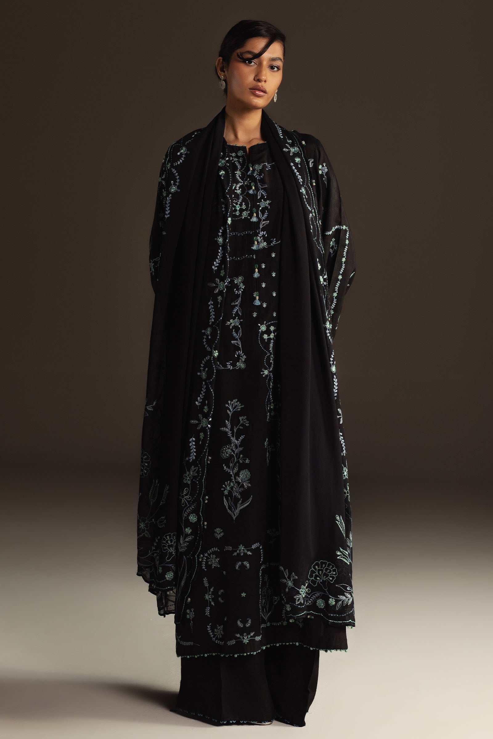 In timeless black, Hoorain combines simplicity with striking elegance. The raw silk shirt features delicate embroidery and bold scalloped detailing on the hem and sleeves, exuding modern refinement. Paired with sleek trousers and an embroidered chiffon georgette dupatta, this ensemble redefines effortless sophistication.