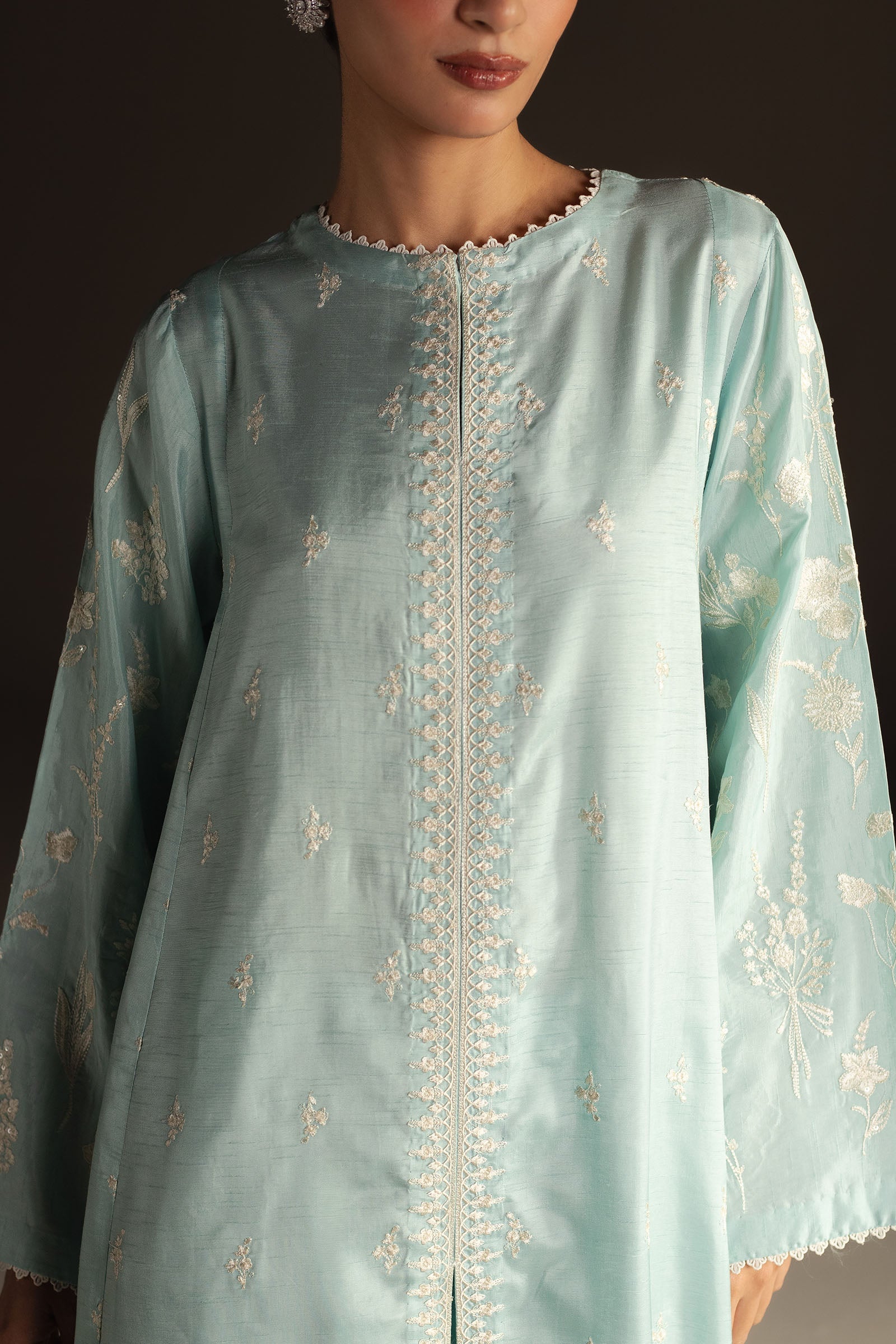 A soft light blue ensemble, Ruqaiya reflects meticulous craftsmanship. The raw silk shirt features elegant ivory embroidery that adds depth and texture to the serene palette. Paired with tapered shalwar and an embroidered organza dupatta, it’s an effortlessly refined festive look.