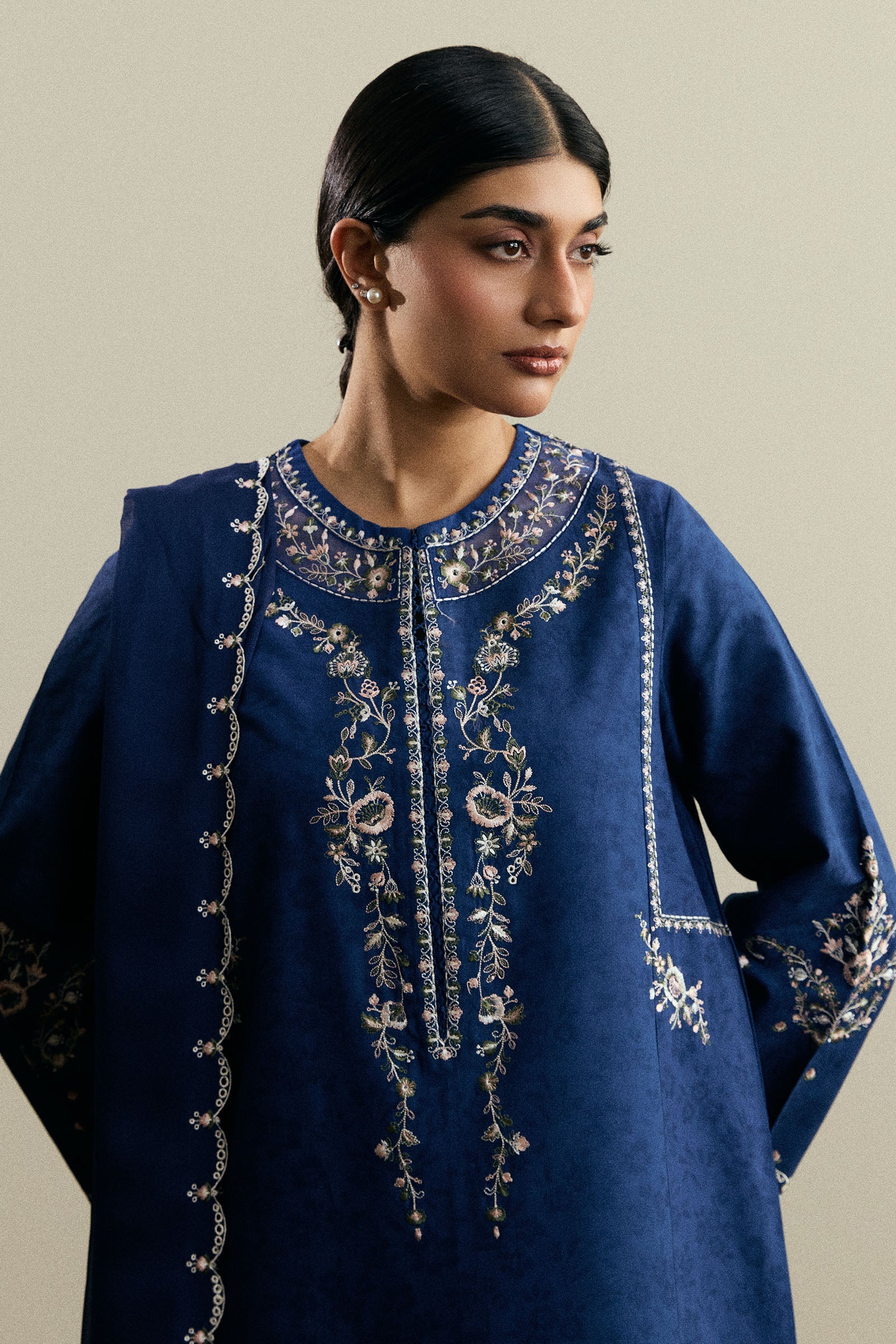 A long dark blue kameez adorned with intricate embroidery on the front, back, and sleeves. Paired with wide-hem embroidered pants and a matching chiffon dupatta, the ensemble exudes refined elegance where traditional artistry meets contemporary style.