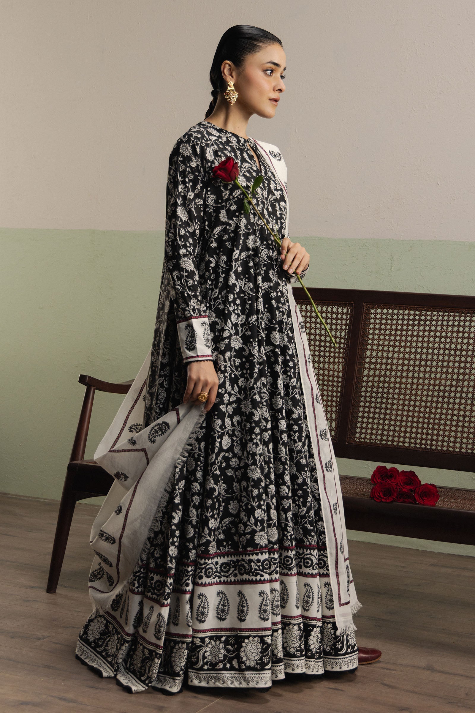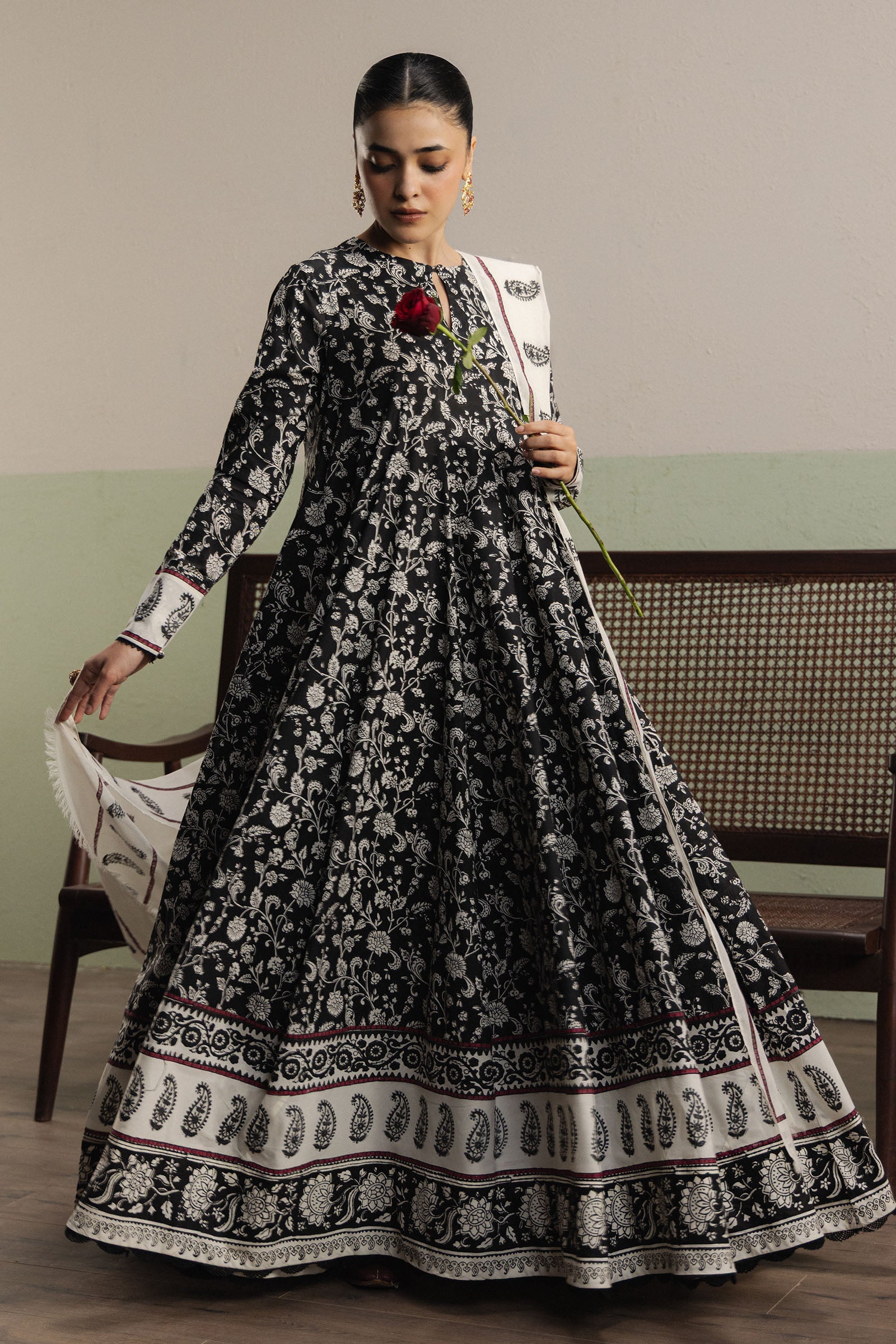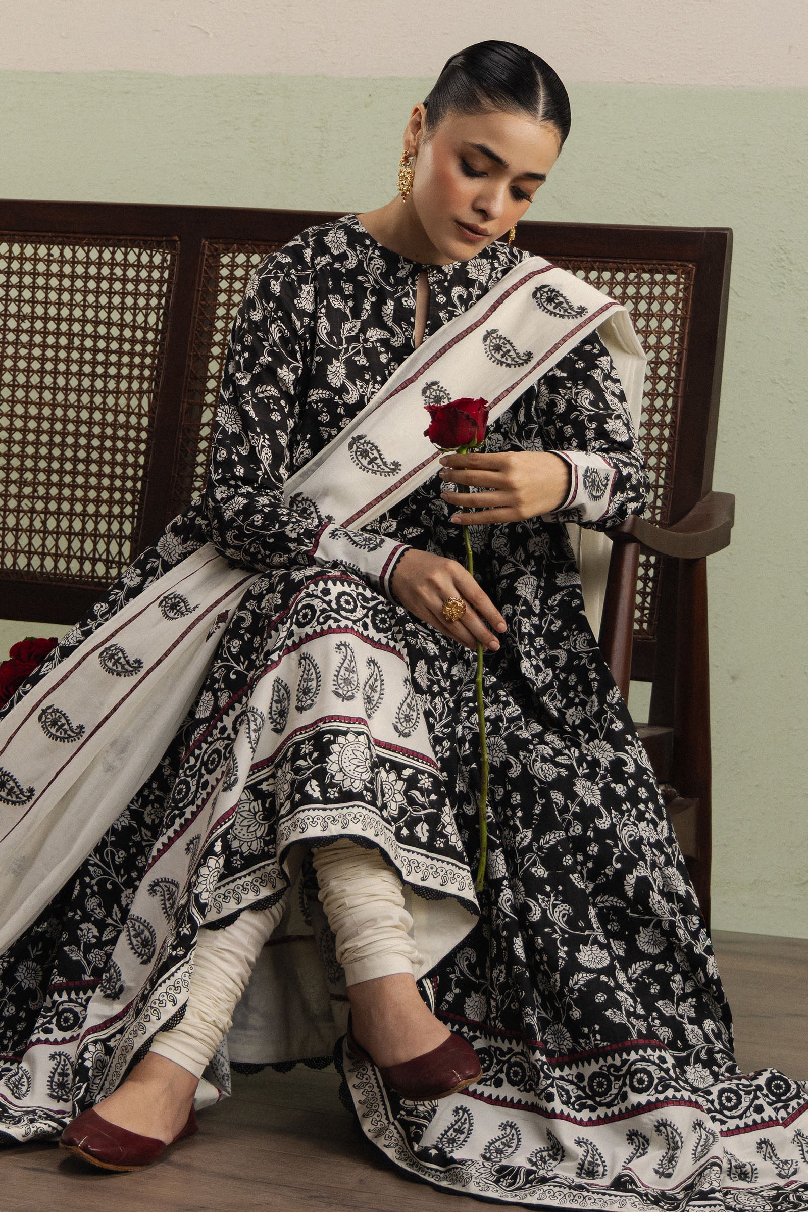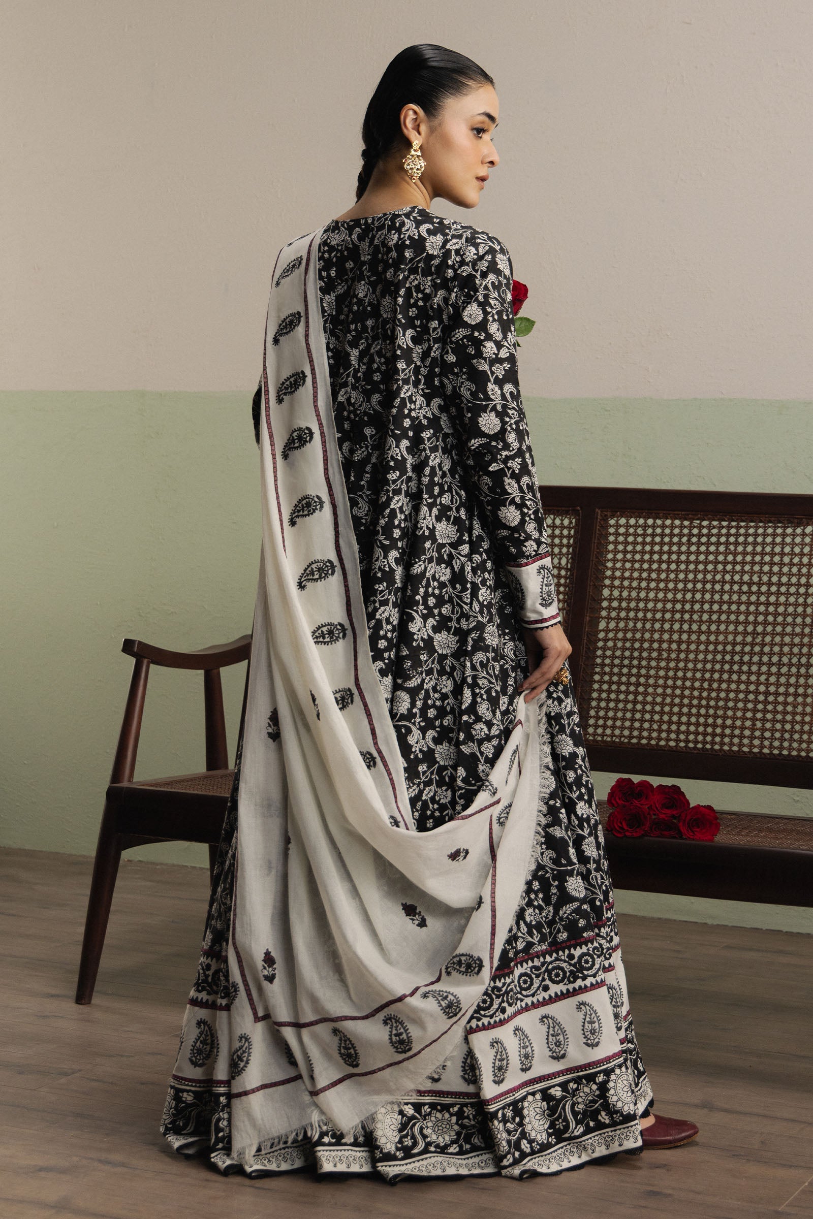 Roshni is a black, full-length Anarkali in delicate voile, featuring fitted full sleeves and decorative borders with vivid red accents along the hem, finished elegantly with black lace. It is paired with a solid off-white cambric choridaar, creating a striking contrast that balances boldness with sophistication. The off-white swiss voile dupatta, adorned with a four-sided red-accented border and paisley detailing along the pallus, completes the ensemble with a refined, festive flair.