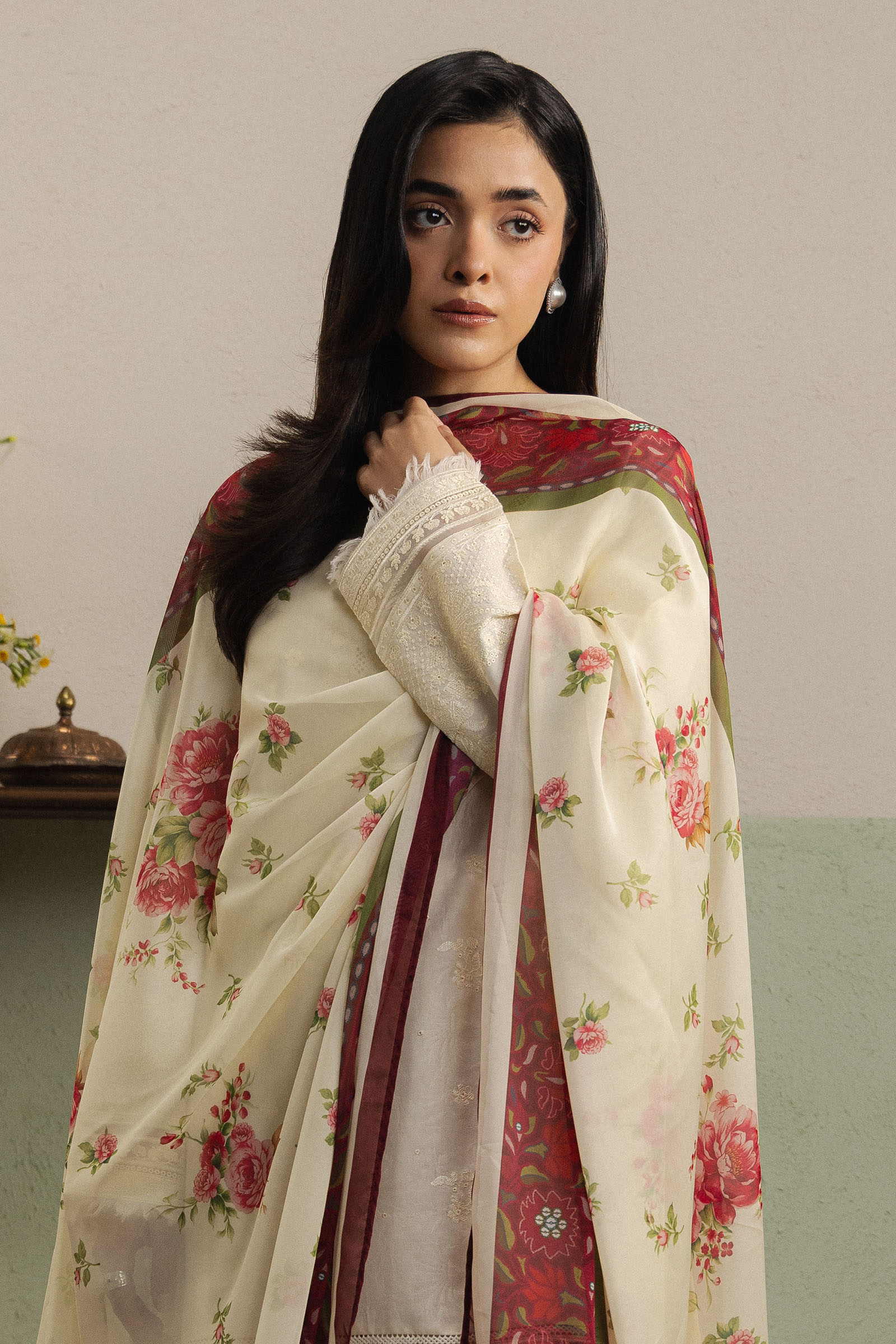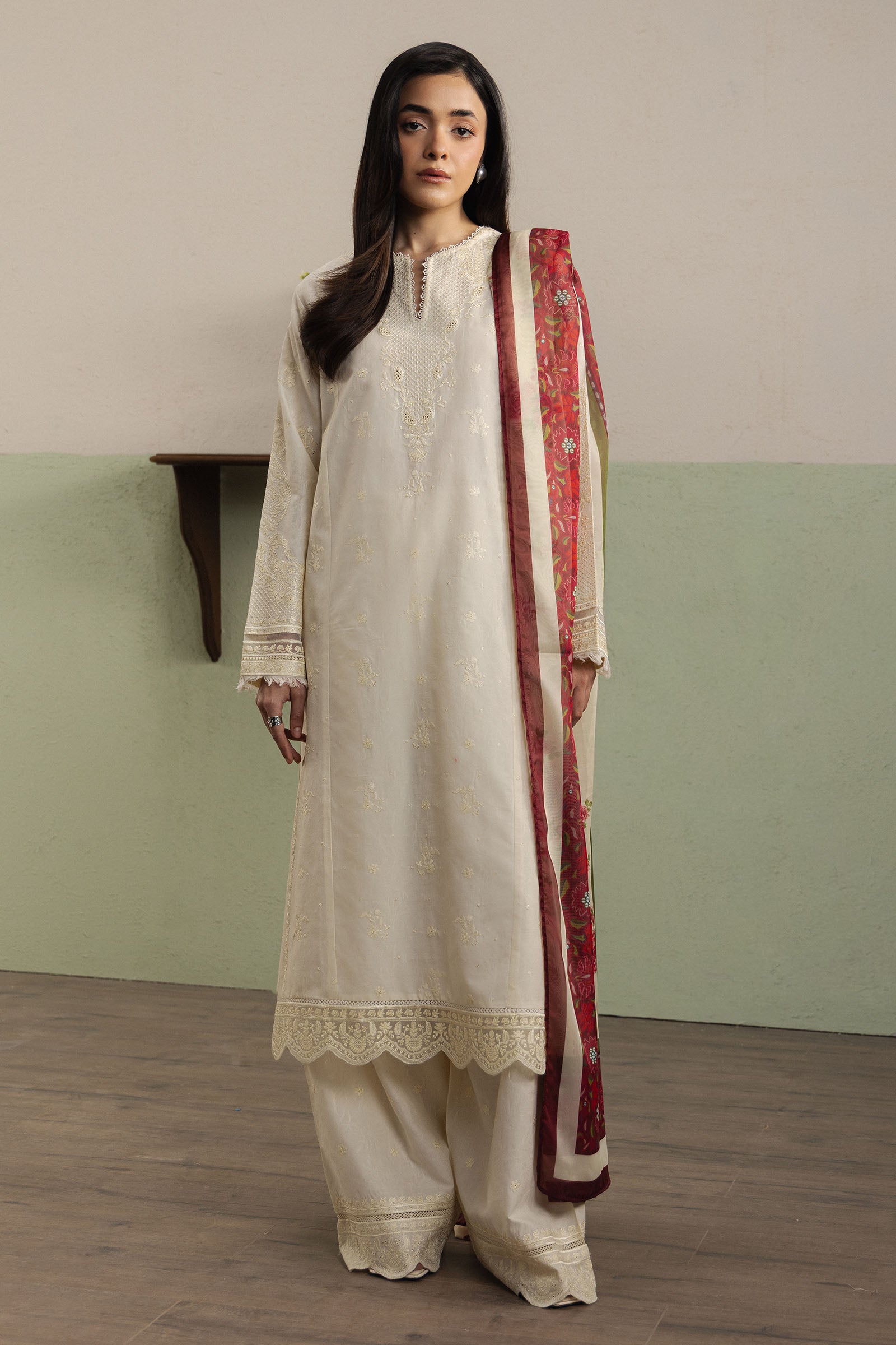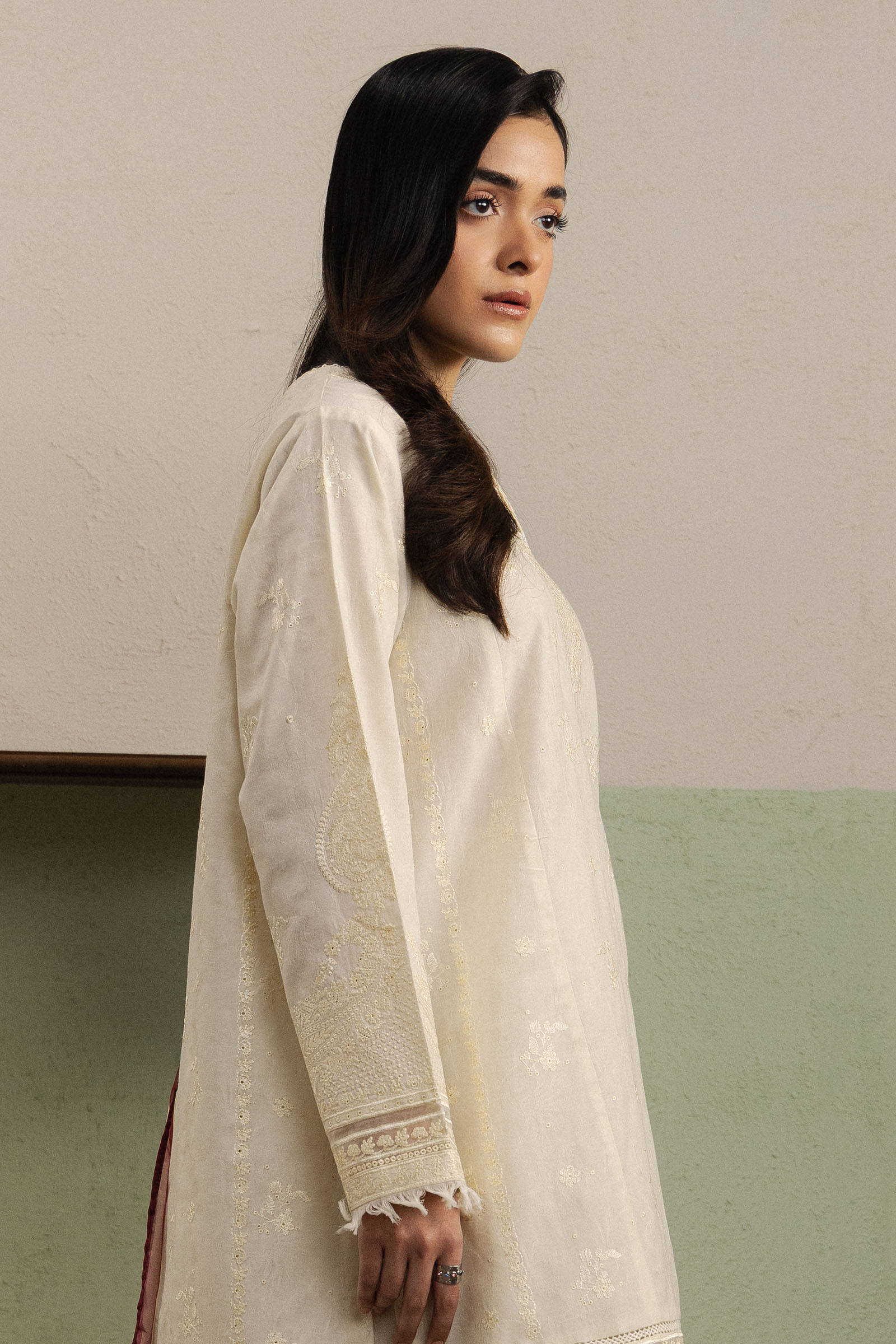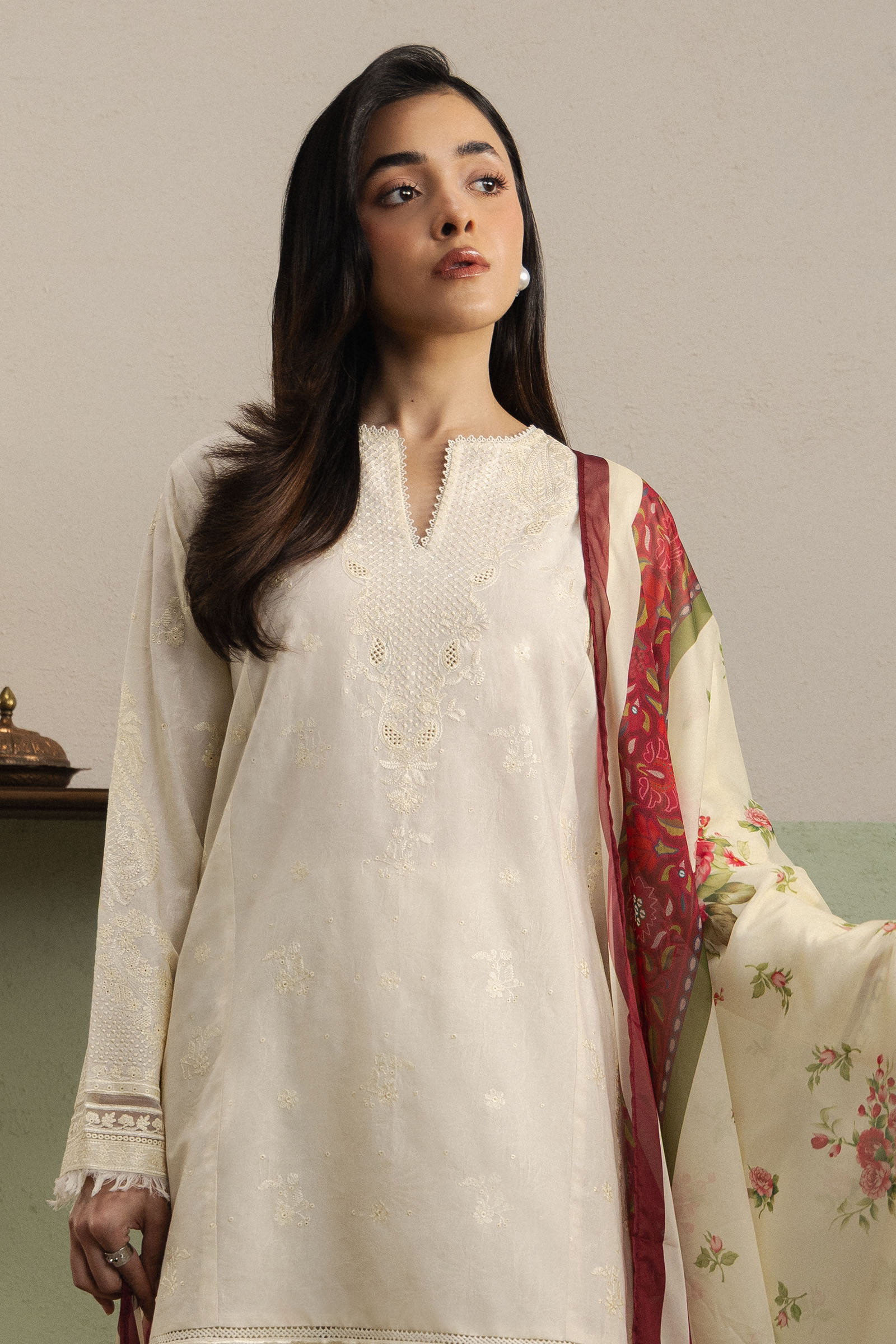 Hoorain is a classic long beige-white dobby kurta, adorned with delicate self-embroidery and subtle sequins that catch the light, lending a refined festive elegance. Paired with a timeless farshi shalwar in matching dobby, the ensemble creates a graceful, flowing silhouette. A printed silk dupatta completes the look, adding a soft contrast and enhancing the overall sophistication of the outfit.
