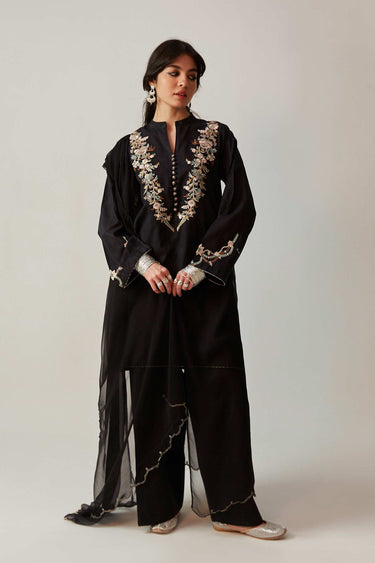 Black short kurta with embroidered neckline and sleeves .It is paired with a flared shalwar and a dupatta.