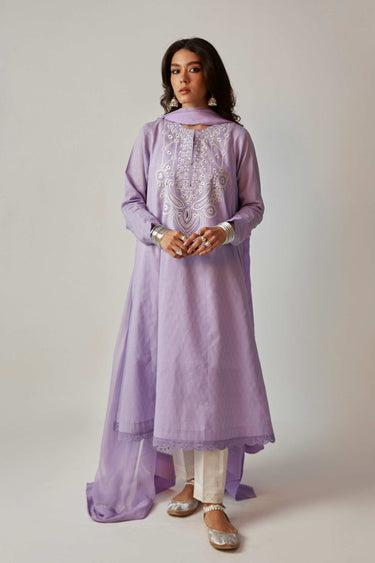 Bright lilac loose fit long kurta with embroidery on the neckline, paired with a straight trousers and a dupatta with corner motifs.
