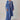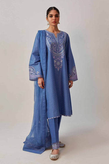 Sapphire blue flared shirt with embroidered neckline, hem and sleeves. It is paired with a straight embroidered trouser and a dupatta.