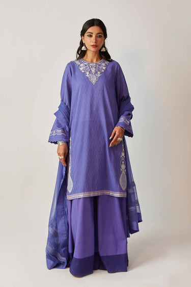 Blue violet shirt with embroidery on the neckline, sleeves, and side seams. It is paired with a flared bottom and a dupatta.