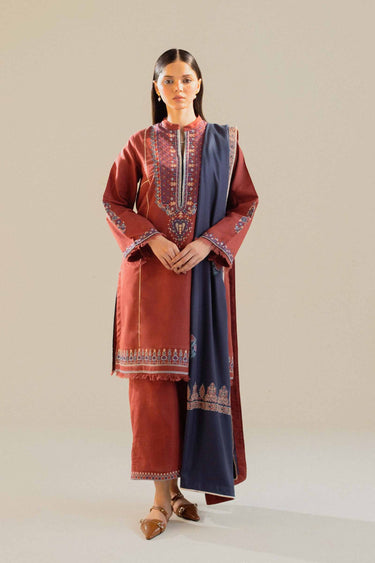This classic Rustic Maroon three-piece winter outfit is the perfect attire for your tea parties, dinners, and workplace events. It features a paneled kurta with an embroidered neckline, sleeves, and hem, an embroidered bottom, and a block-printed Navy Blue shawl. Tailored to perfection, this dress can help you look classy and stylish at all kinds of events.