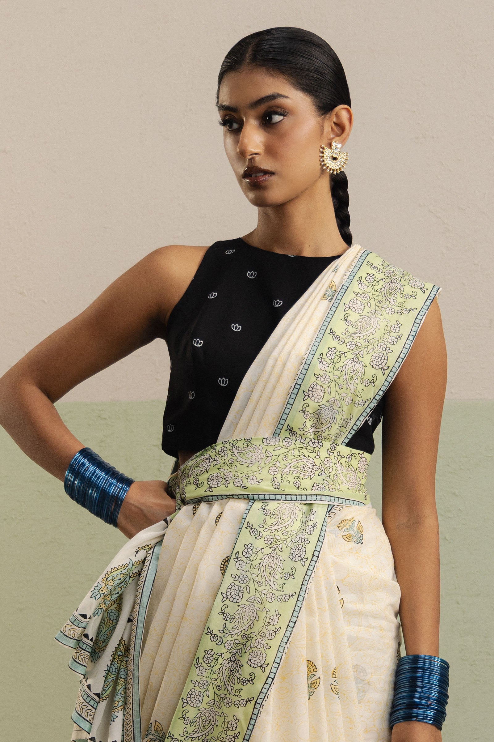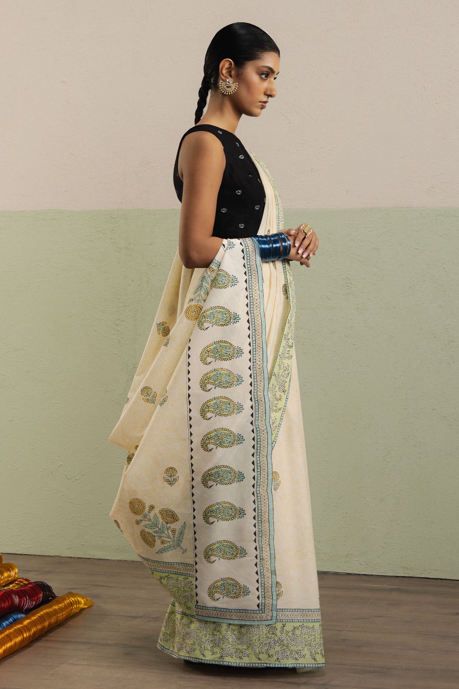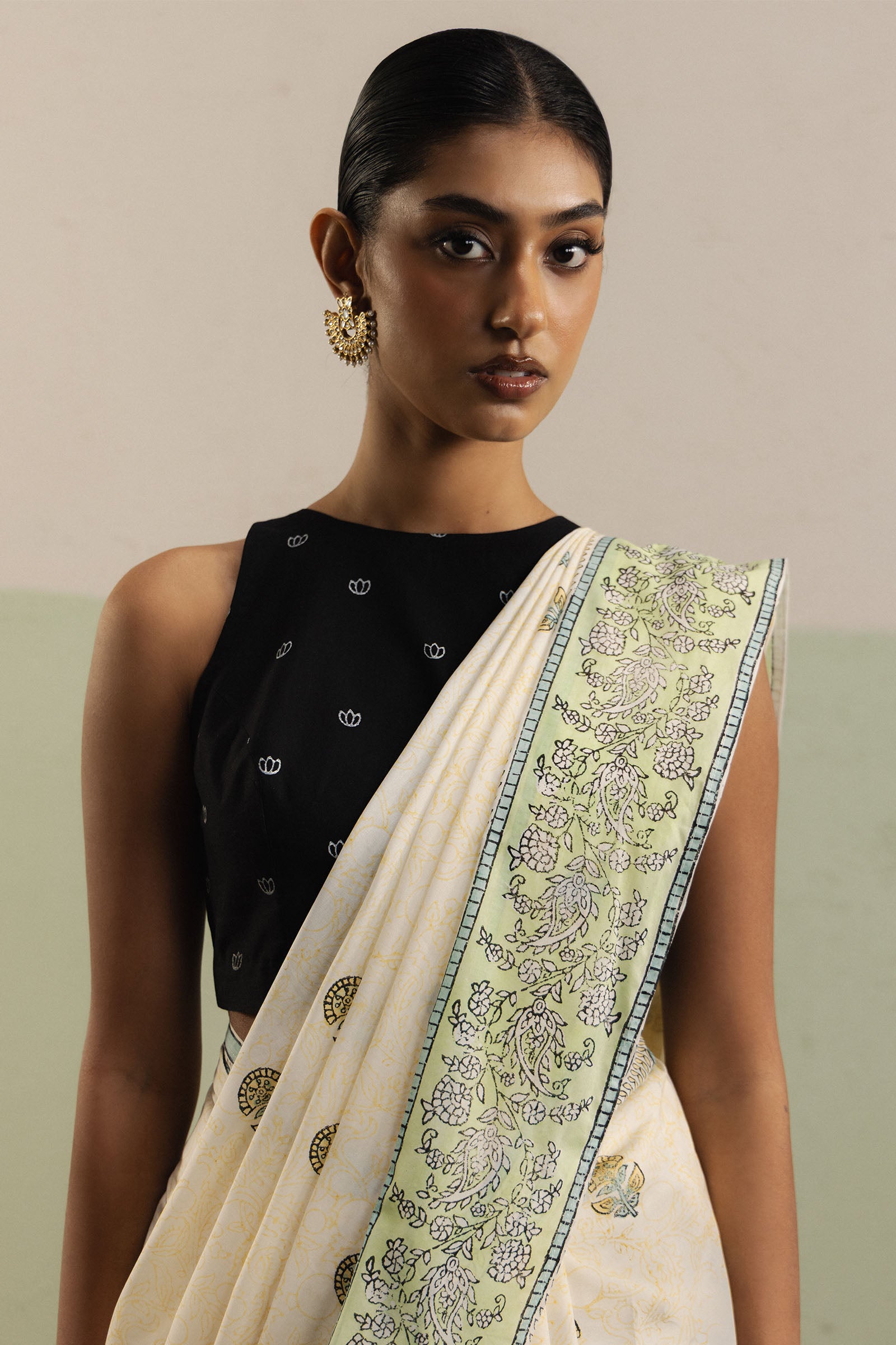 Gulbahar is an off-white swiss voile saree, adorned with a delicately detailed pallu featuring floral and paisley motifs, and accented with a soft green border that adds subtle freshness to the ensemble. The saree body is enhanced with a scattered floral spray, creating a light and festive charm. Paired with a black cambric blouse, featuring a small white paisley print and provided unstitched for a personalized fit, the look combines elegance with versatility. A plain off-white cambric petticoat completes the set, allowing for effortless draping and graceful movement.