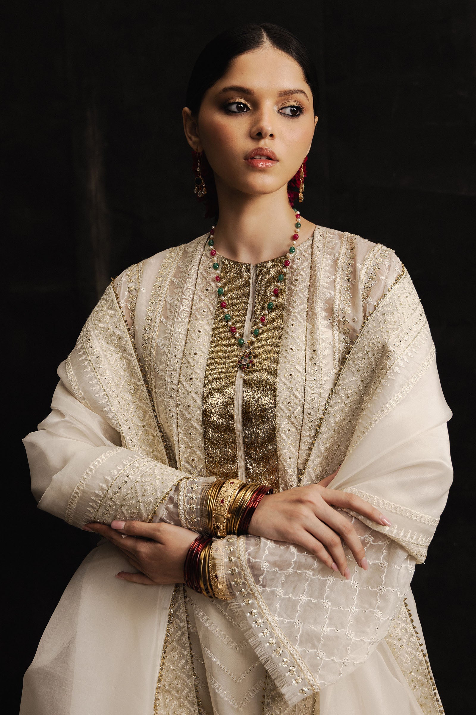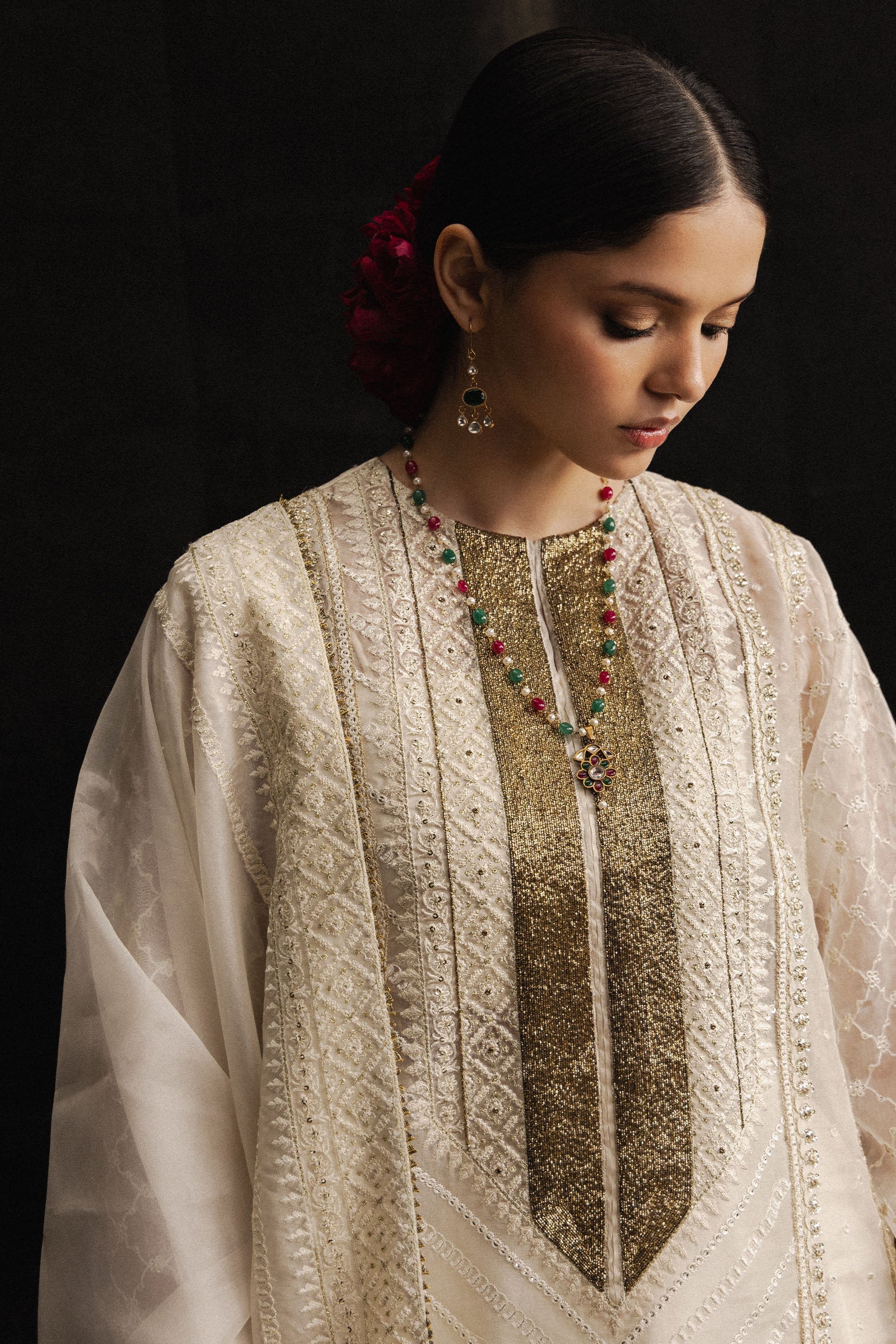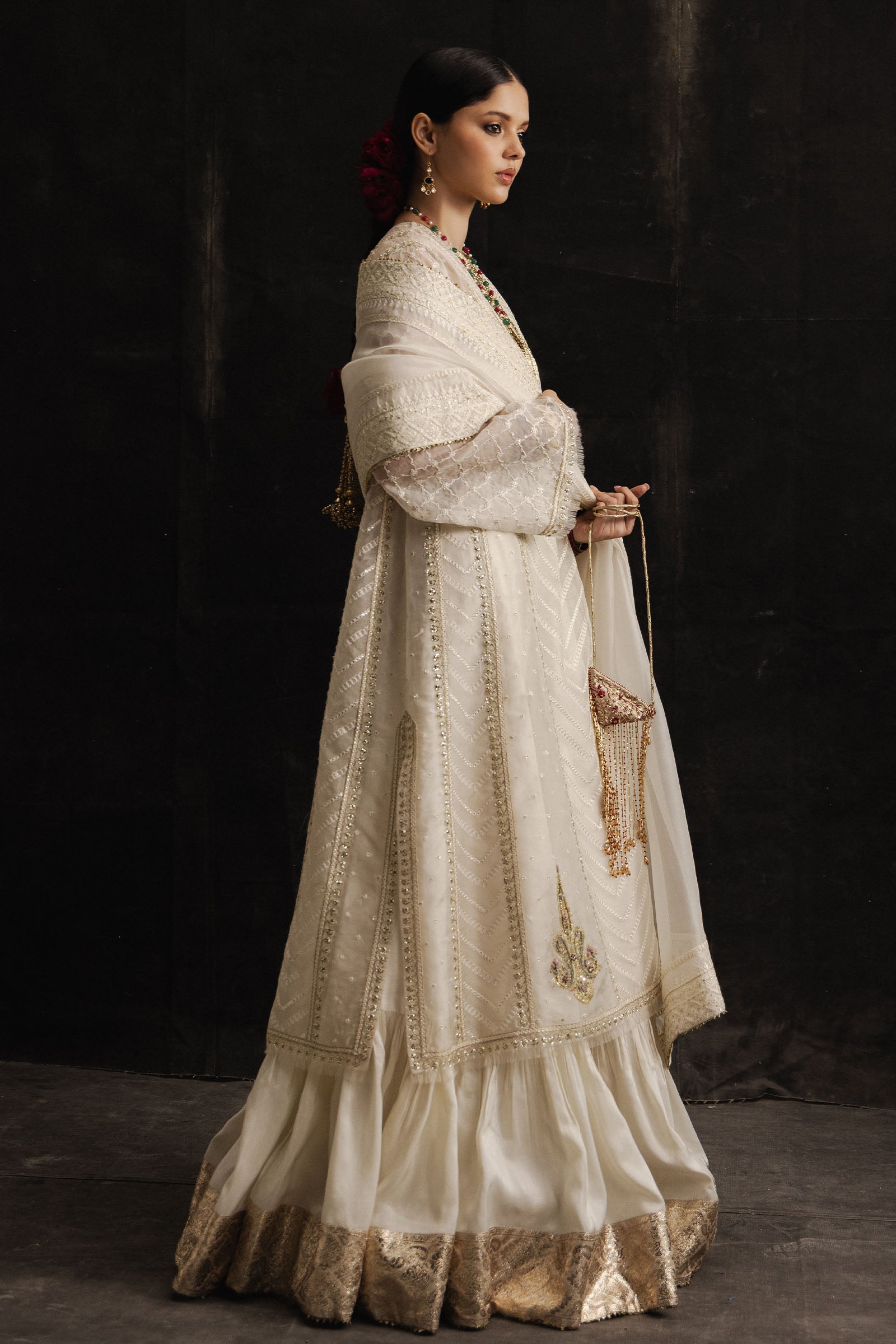 Zarrin embodies understated elegance, crafted for those who appreciate beauty in refined detail. The ivory pure organza kurta, cut in a graceful five-panel silhouette, is layered over a korean raw silk bustier featuring a naqshi-embellished neckline and delicately placed motifs. Brought to life with embroidery and enriched with traditional adda work, the design speaks to enduring artistry.