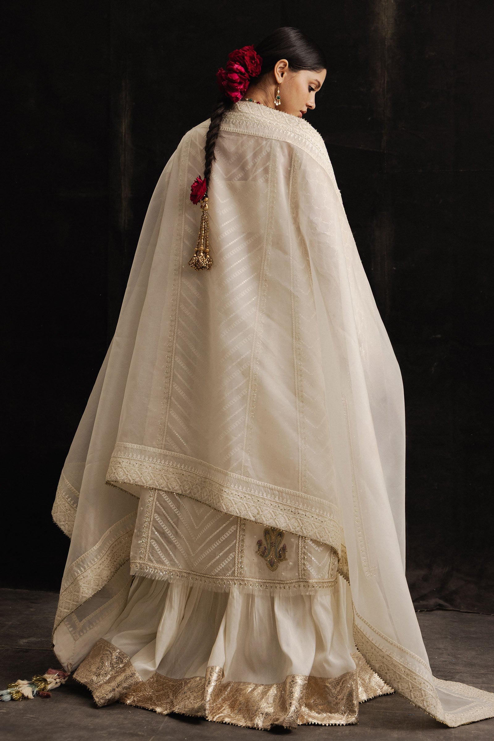 It is paired with a korean raw silk gharara, elevated with a luxurious Kamkhwab border that adds structure and heritage charm to the ensemble. Completing the look is an embroidered pure organza dupatta, finished with tassel details that lend a subtle sense of movement and festive finesse.