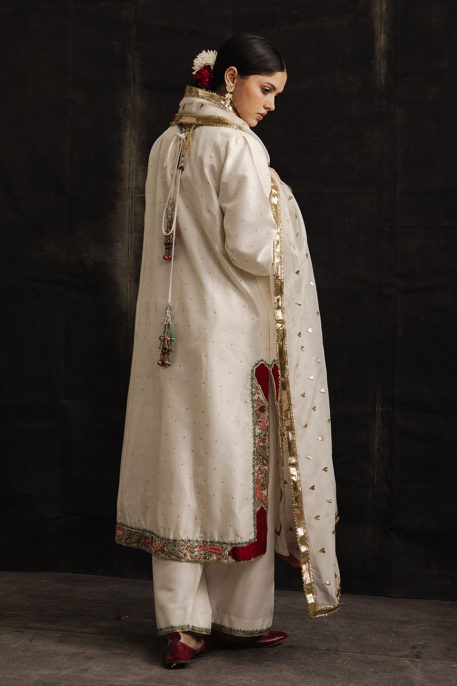 It is paired with a pure raw silk shalwar, adorned with subtle adda details, maintaining a balanced and elegant silhouette. The look is completed with a sheer pure organza dupatta, finished with delicate gotta appliqué that imparts just the right hint of festive charm.