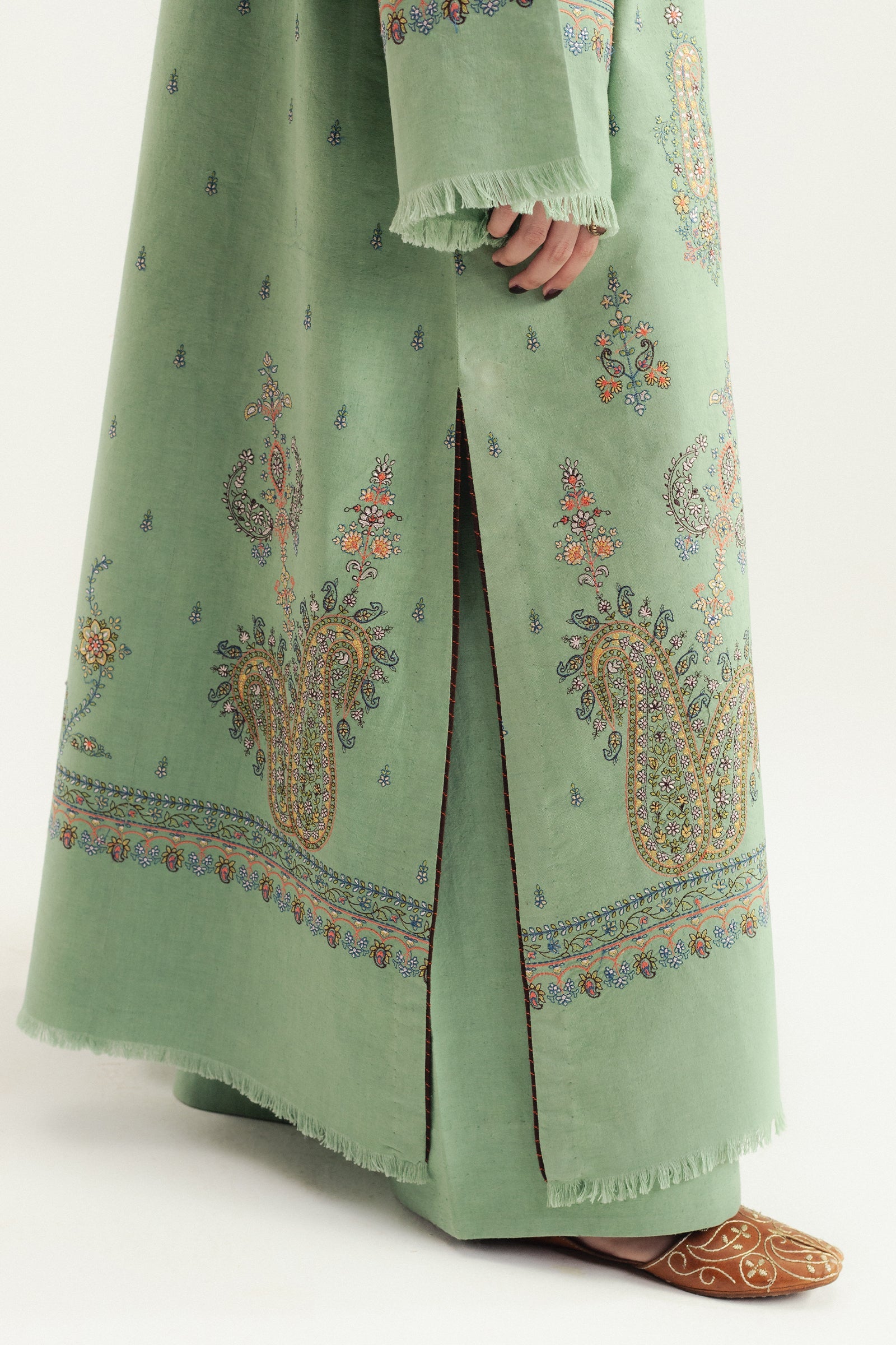 An aqua karandi shirt featuring heavy Kashmiri paisley embroidery on the front and back, showcasing intricate craftsmanship in traditional motifs. Paired with a dark brown marina shawl embroidered in soft hues of aqua and a matching karandi trouser, this ensemble beautifully blends warmth, heritage, and elegance.