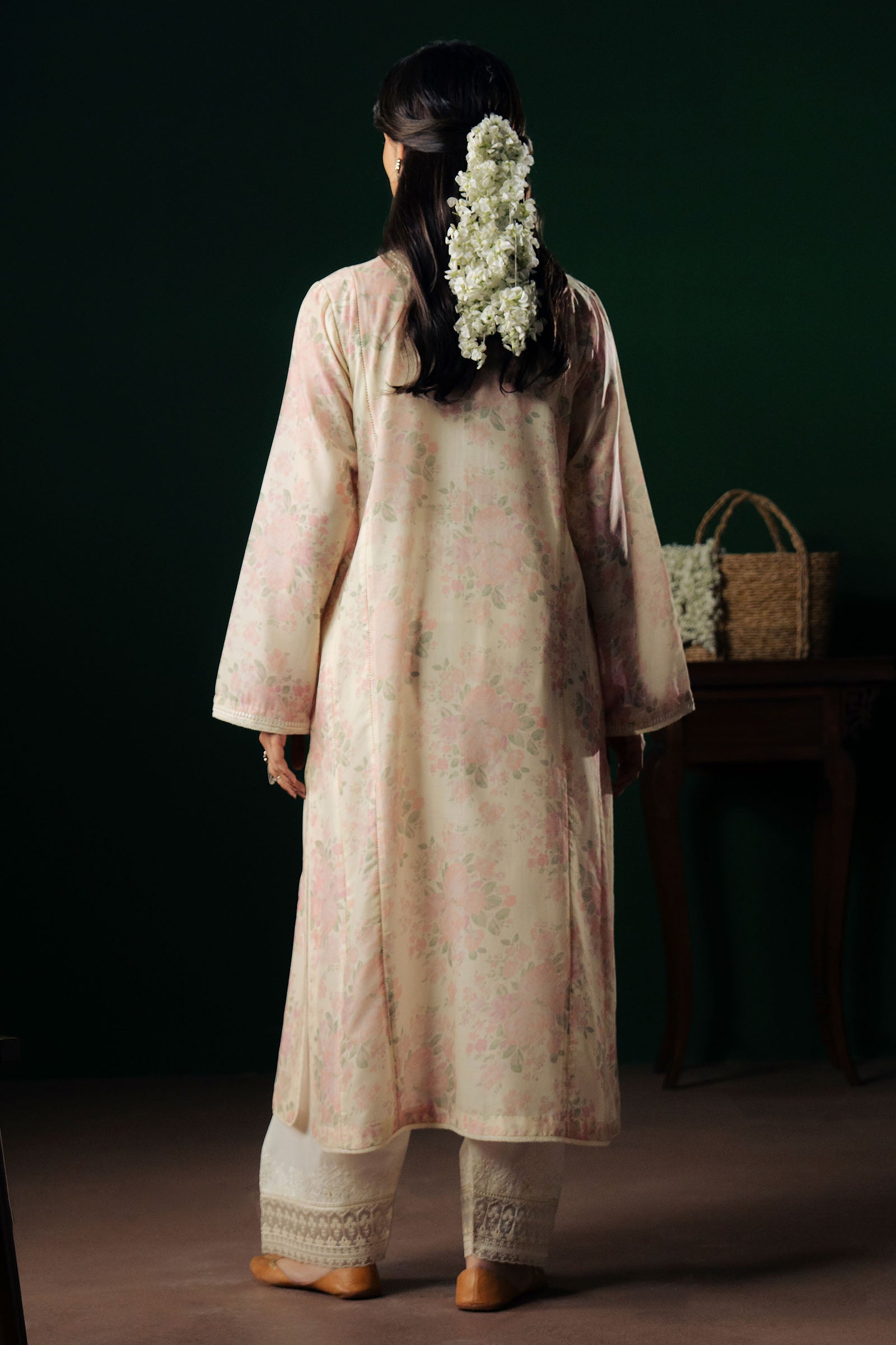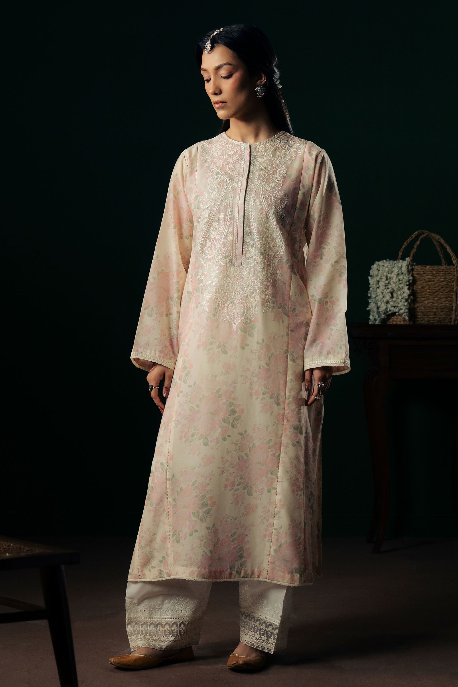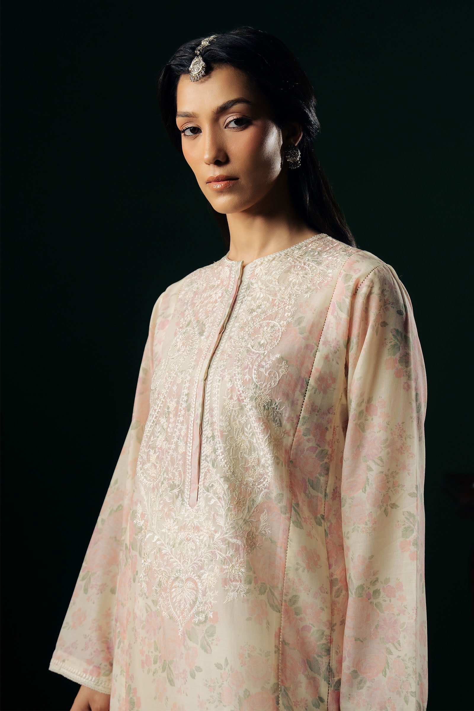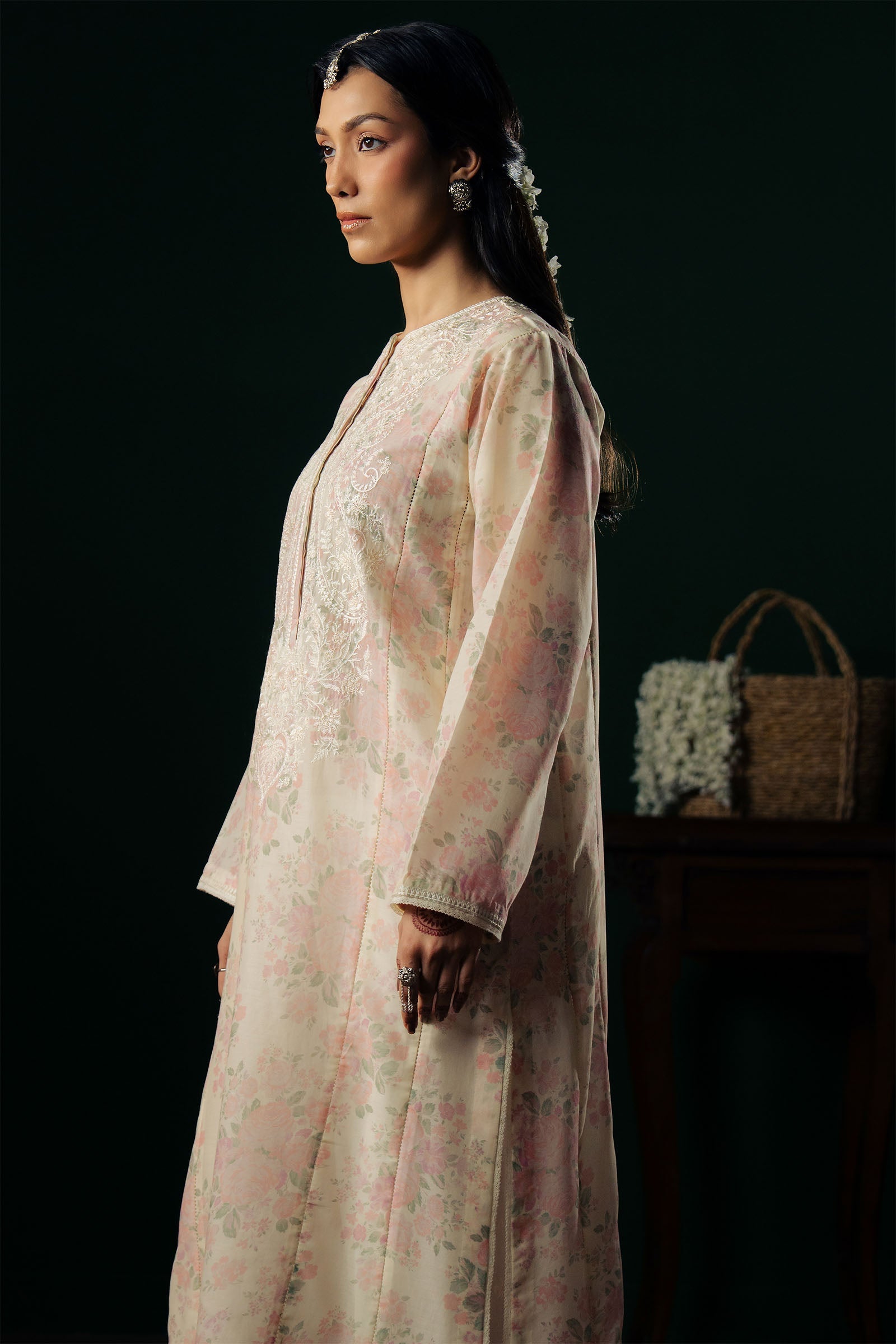 Raima is a long-length printed kurta that radiates soft, graceful, and effortless elegance. The base features a delicate print in soothing pastel tones, creating a light, refreshing aesthetic. An intricately embroidered neckline on both the front and back adds a refined touch of craftsmanship, while subtle embroidery detailing on the sleeves enhances the overall design with thoughtful detail.