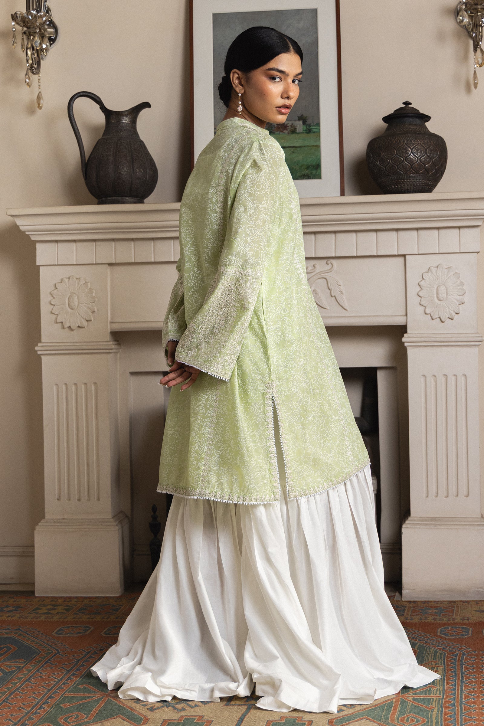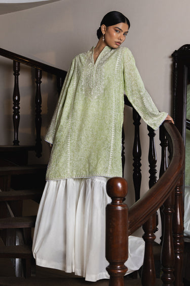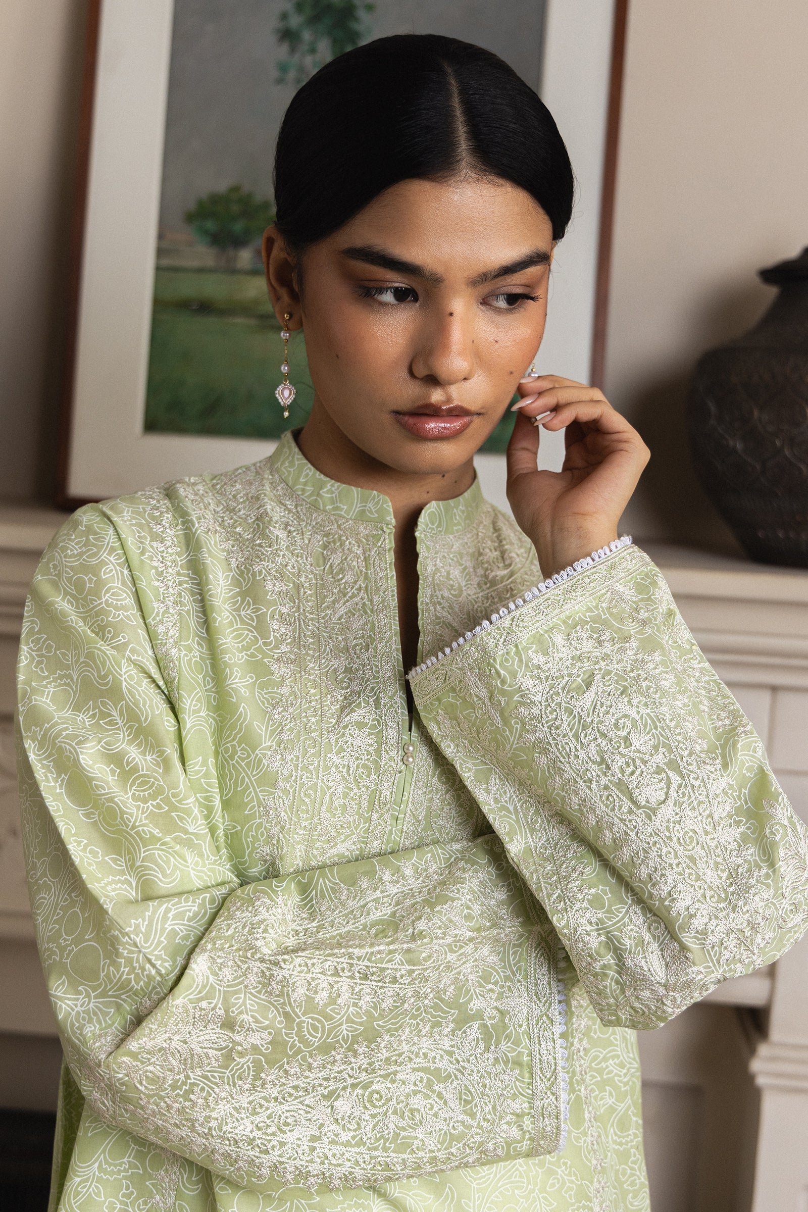 Sabaa is a fresh green kurta designed with a modern, relaxed sensibility. Cut in a short, boxy silhouette, it offers effortless wearability while maintaining a contemporary edge. The surface is adorned with delicate off-white screen printing, creating a soft visual rhythm across the fabric. Intricate aari work on the neckline and sleeve hems adds a layer of refined craftsmanship, elevating the simplicity of the piece. Sabaa is an easy yet polished choice for everyday elegance.