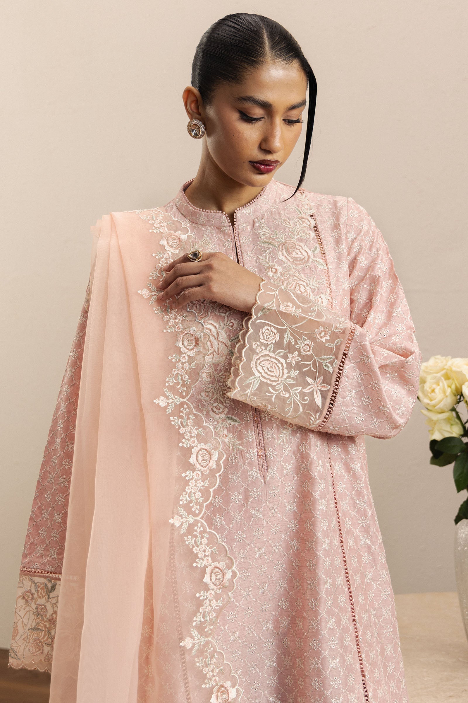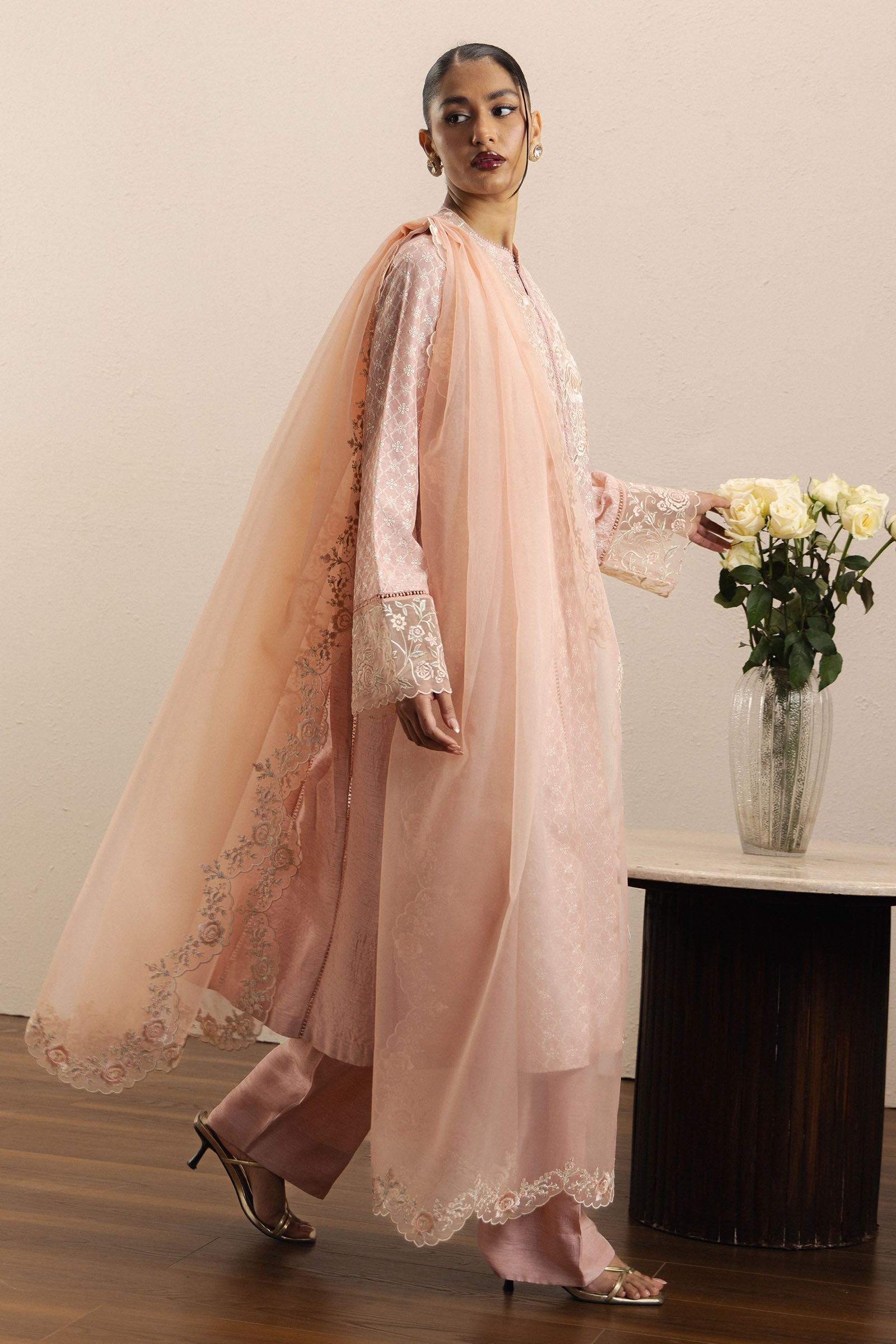 Paired with a farshi shalwar, the silhouette flows with poise and sophistication, while a luxurious organza dupatta, finished with embellished scallops, completes the look with a touch of ethereal charm. Gulkar reflects Zara Shahjahan’s philosophy — where meticulous craftsmanship, heritage-inspired design, and effortless elegance converge to create festive wear that is both timeless and enchanting.