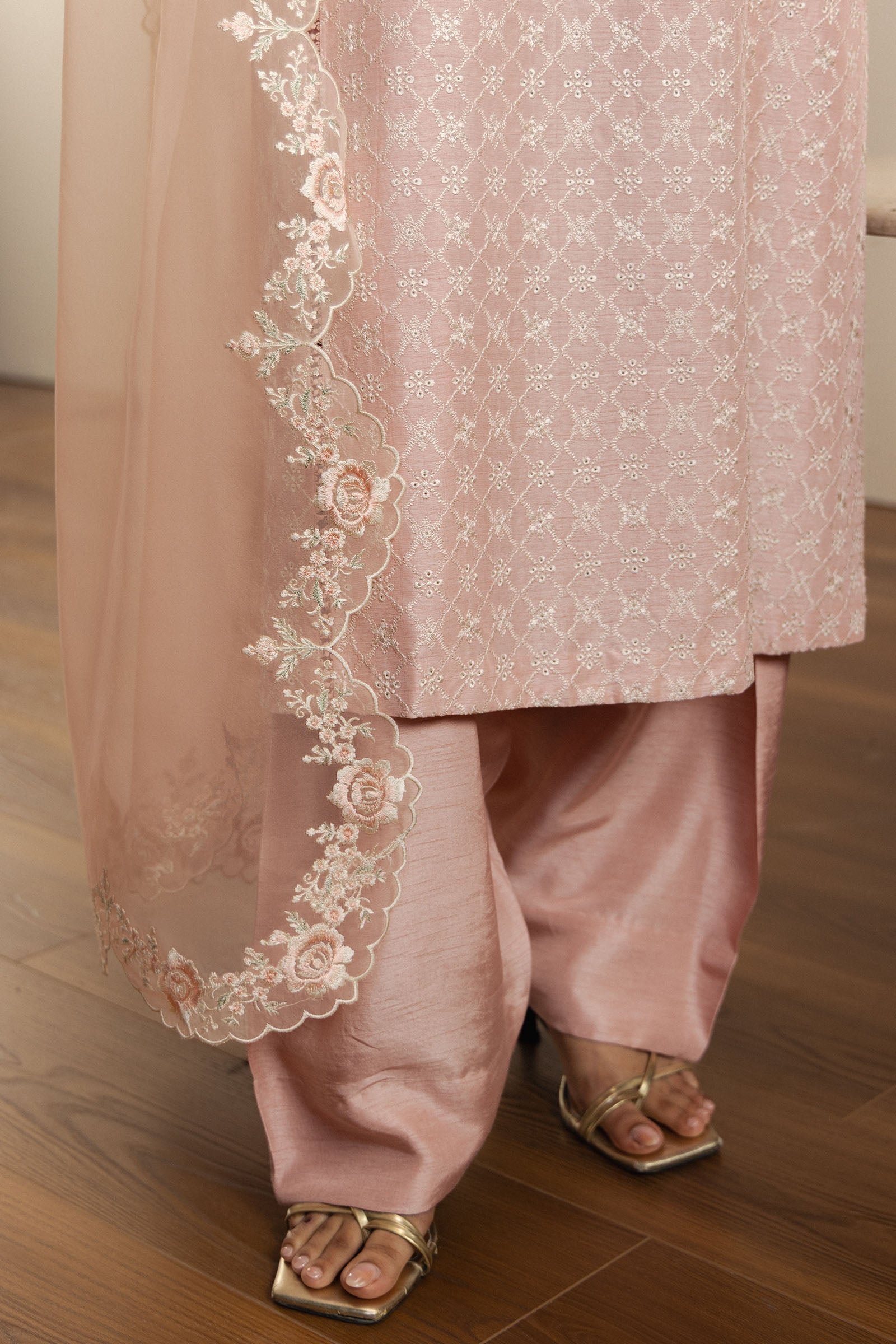 Gulkaar embodies timeless elegance with a contemporary perspective. The ensemble features a graceful paneled long kurta, enriched with delicate chikankari and floral embroidery at the neckline, creating a silhouette that seamlessly bridges heritage and modernity. Embroidered organza sleeves add subtle texture and refinement, enhancing the kurta’s intricate detailing.