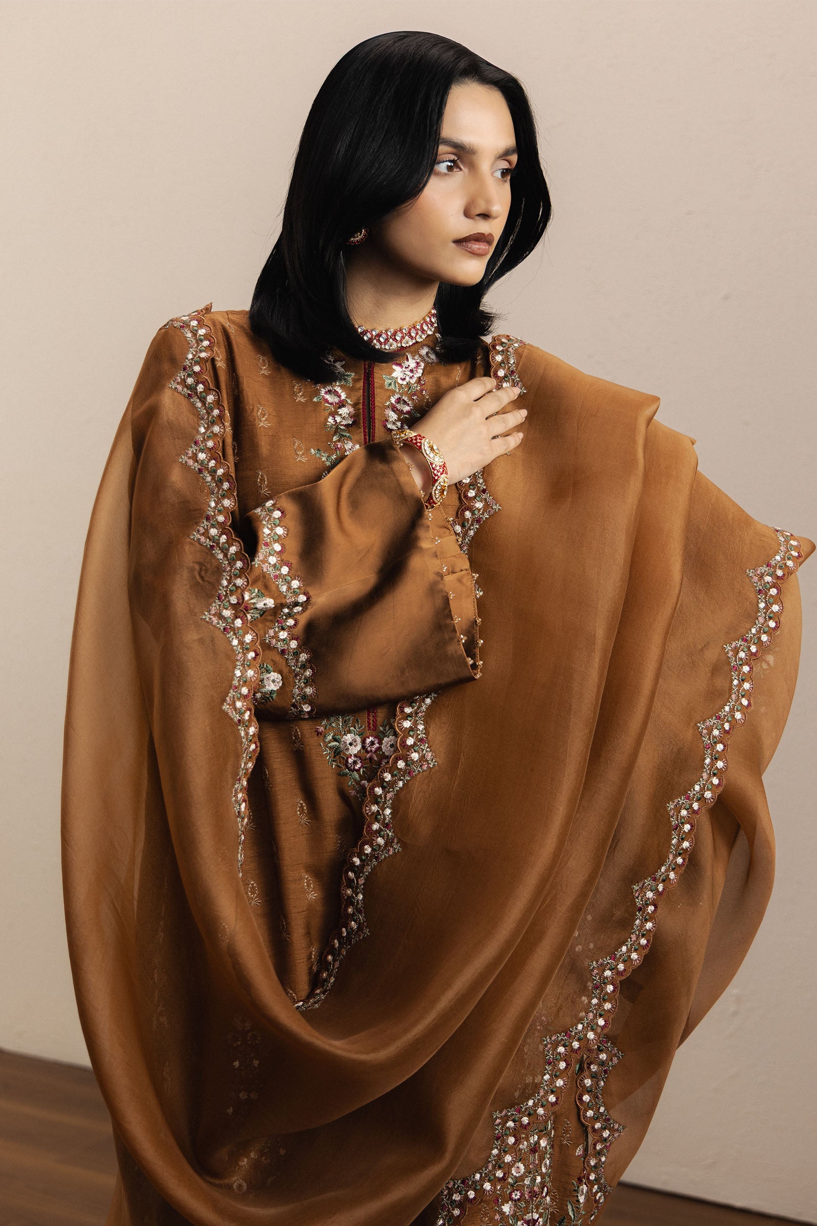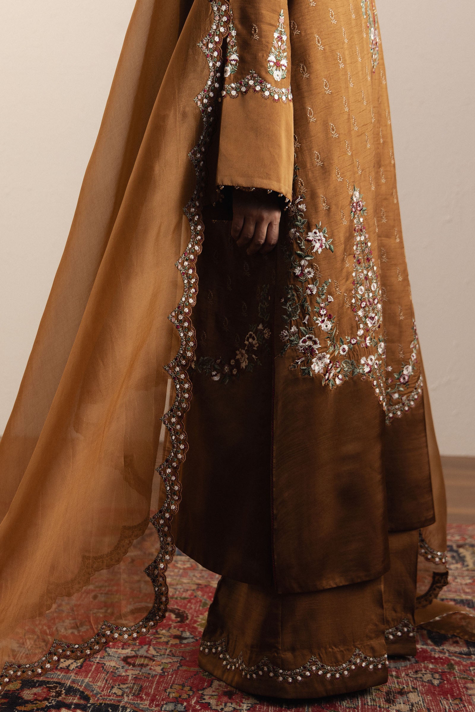 Munawwar is a regal gold raw silk ensemble, celebrating festive elegance with subtle sophistication. The kurta is adorned with intricate antique tilla and resham embroidery, delicately accented with hints of red and green, creating a rich and textured visual narrative. Paired with wide-hem embroidered pants, the silhouette exudes effortless refinement. A luxurious organza dupatta, finished with embroidered bunches, completes the ensemble, reflecting Zara Shahjahan’s ethos of graceful craftsmanship, timeless beauty, and celebratory charm.