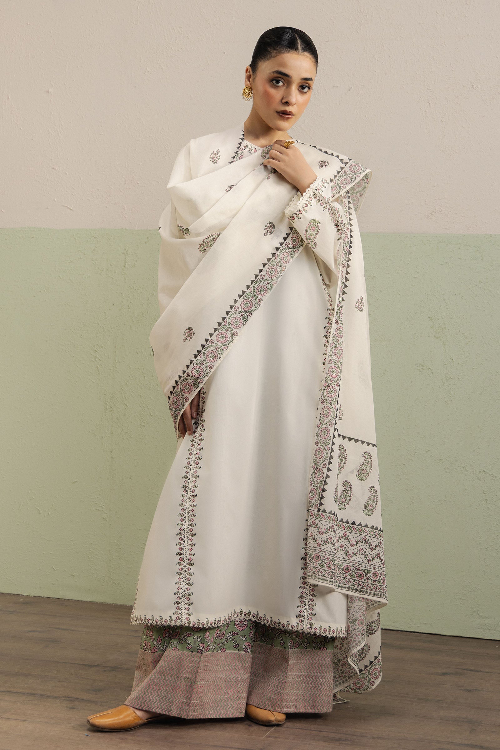 Meher is an off-white, three-paneled voile kurta, with each panel exquisitely enhanced with handcrafted intricate borders. The composed sleeves are finished with delicate crochet lace, adding a touch of refined elegance. Paired with a contrast-colored cambric farshi shalwar, featuring an accent-colored chevron decorative border at the bottom opening, the ensemble balances grandeur with contemporary wearability. The swiss voile dupatta is adorned with a four-sided border and double borders along the pallus, elevating the overall festive charm and flowing silhouette.