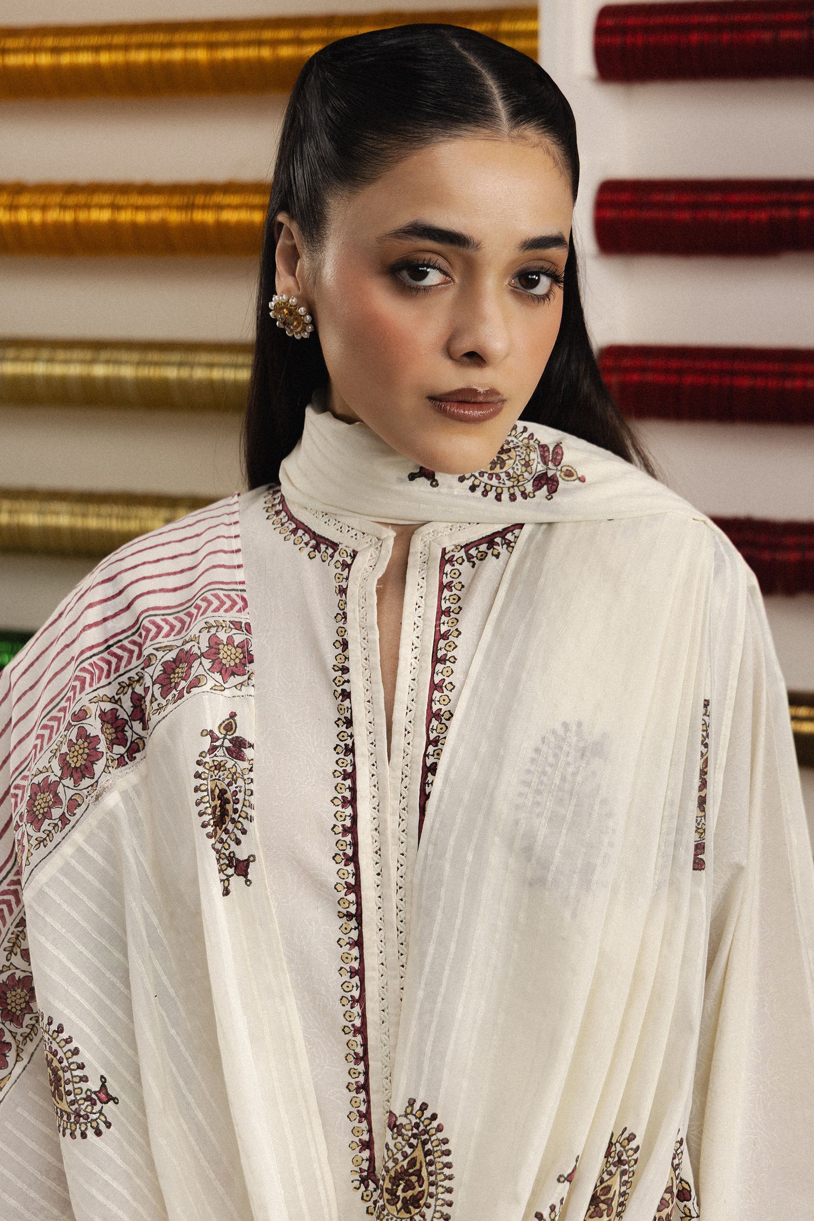 Rangrez is a soft off-white, three-paneled voile kurta, delicately adorned with scattered maroon and olive paisley motifs that create a subtle yet festive charm. The neckline is finished with fine piping and a clean slit detail, while diagonal-printed panels along the sides add gentle contrast and visual interest. The hem and sleeves are accented with a deeper maroon border, enhancing definition and elegance. Paired with matching printed border cambric culottes and a coordinating swiss voile dupatta featuring striped and floral border detailing, the ensemble is a harmonious blend of tradition and contemporary comfort.