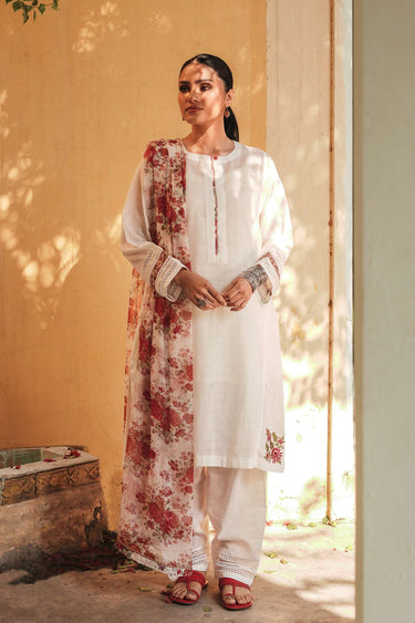 White loose fit kurta with embroidery detail on the back and sleeves, paired with a white shalwar and a white floral dupatta.