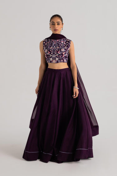 Purple choli crafted with gara jaal, further enhanced with adda work, paired with lehnga and a dupatta.