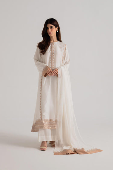 Daisy white classic paneled shirt, crafted with ari embroidery and zardozi details, paired with sharara pants and an embroidered dupatta.