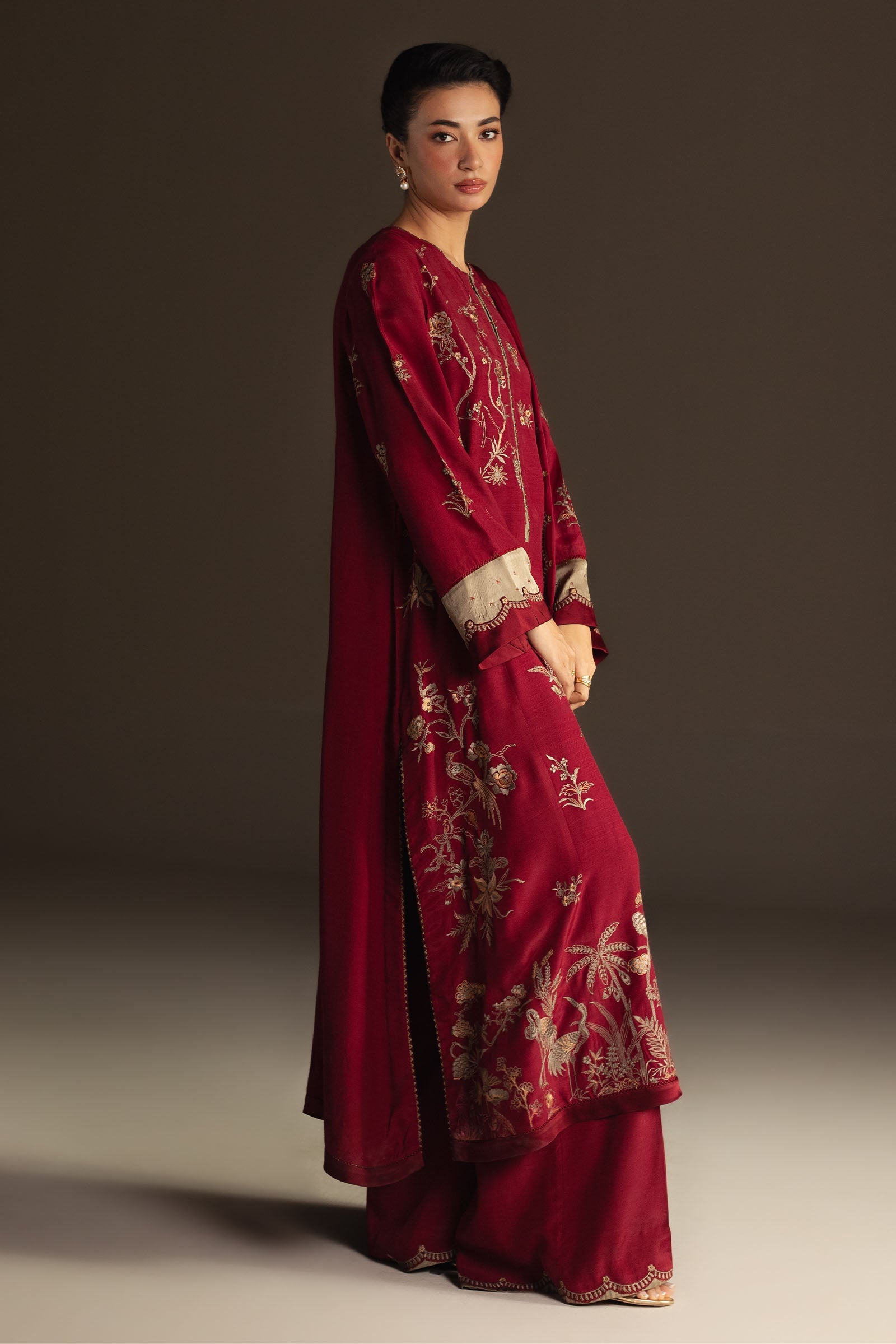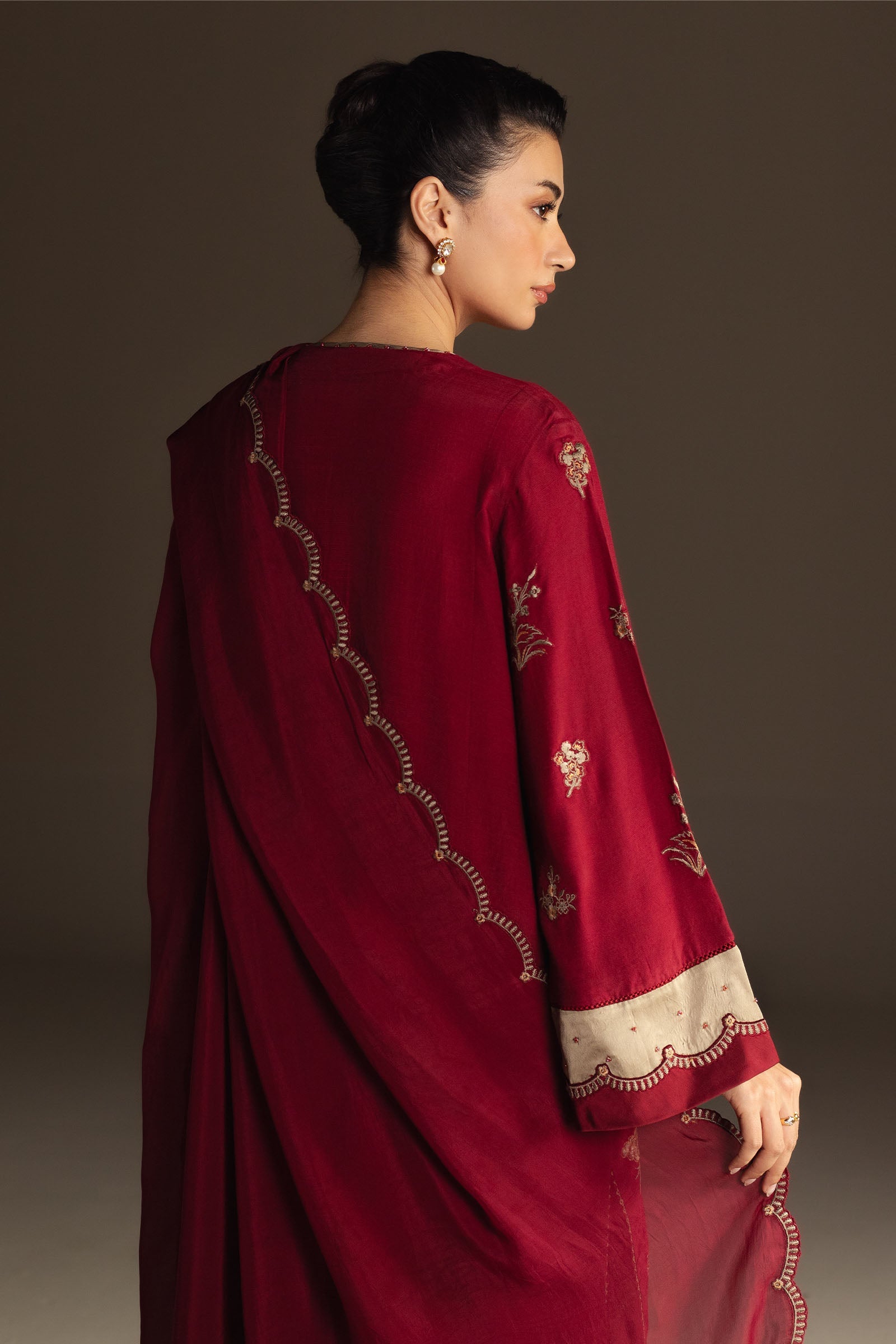Ayra is a dark burgundy ensemble that exudes quiet sophistication. The shirt showcases intricate embroidery in moss green and beige tones, enhanced with subtle satin finishing that adds a gentle play of texture. Paired with straight-fit pants and a rich silk dupatta edged with scallop detailing, this look is timeless, versatile, and undeniably elegant.