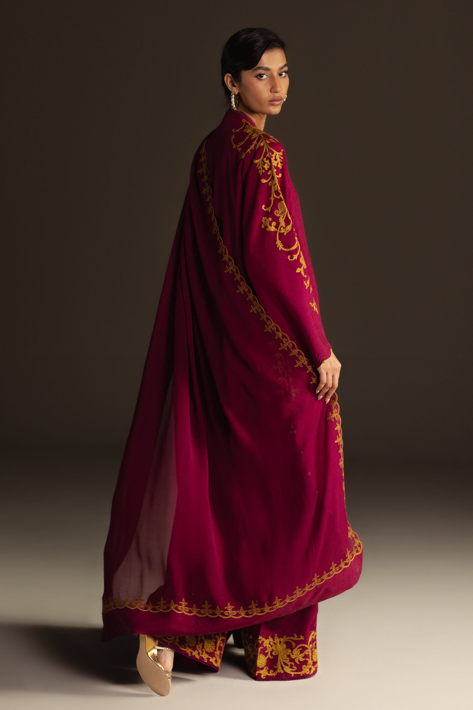 Ameera in soft plum strikes a delicate balance between freshness and refinement. The raw silk shirt features light green aari embroidery across the front and sleeves, accentuated by contrast finishing on the neckline, hem, and cuffs. Paired with loose-fit trousers and a lightly embroidered georgette dupatta, it’s a subtle yet striking choice for any occasion.